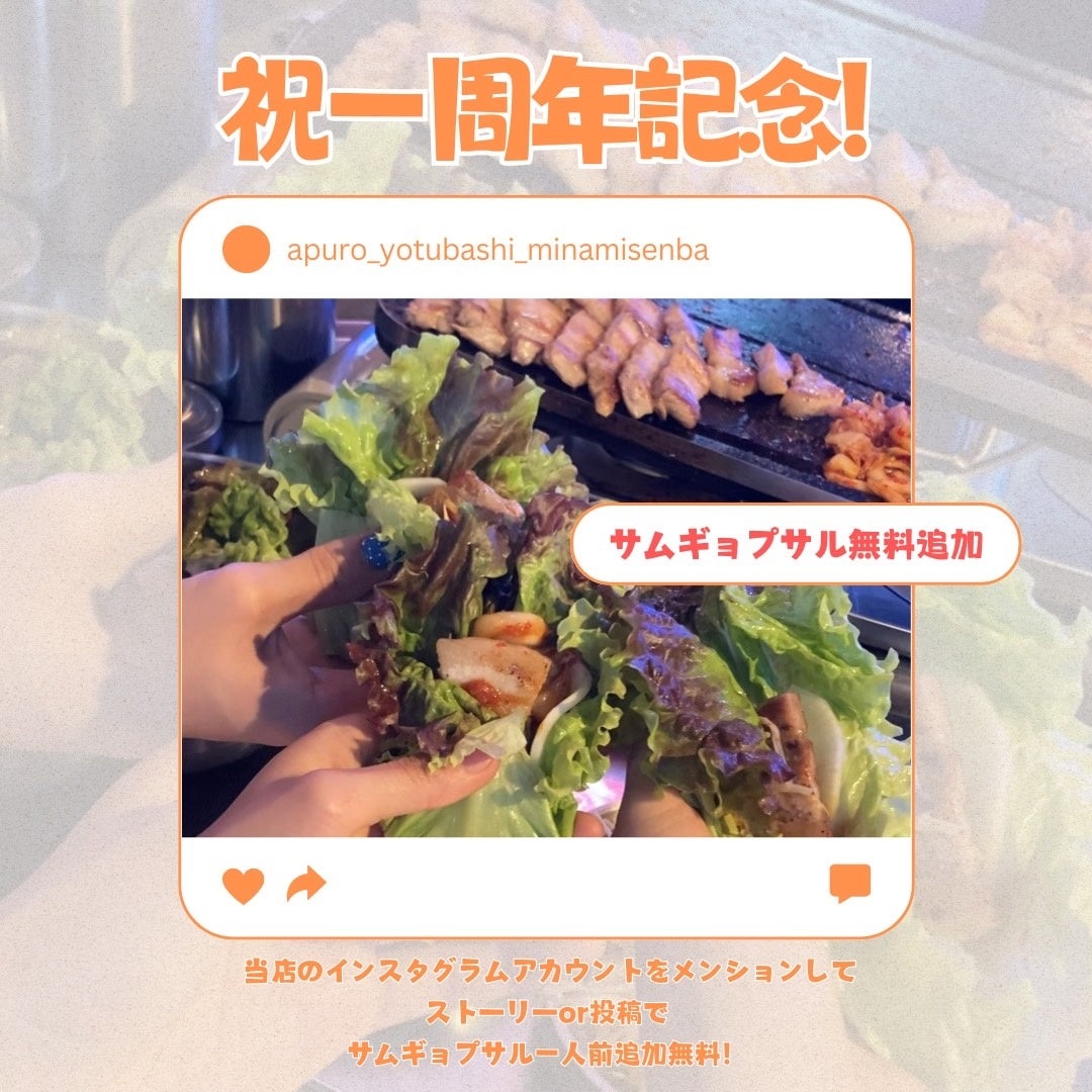 サムギョプサルご注文のお客様に追加お肉の無料プレゼント!小さな韓国あぷろ四ツ橋南船場店1周年記念キャンペーン