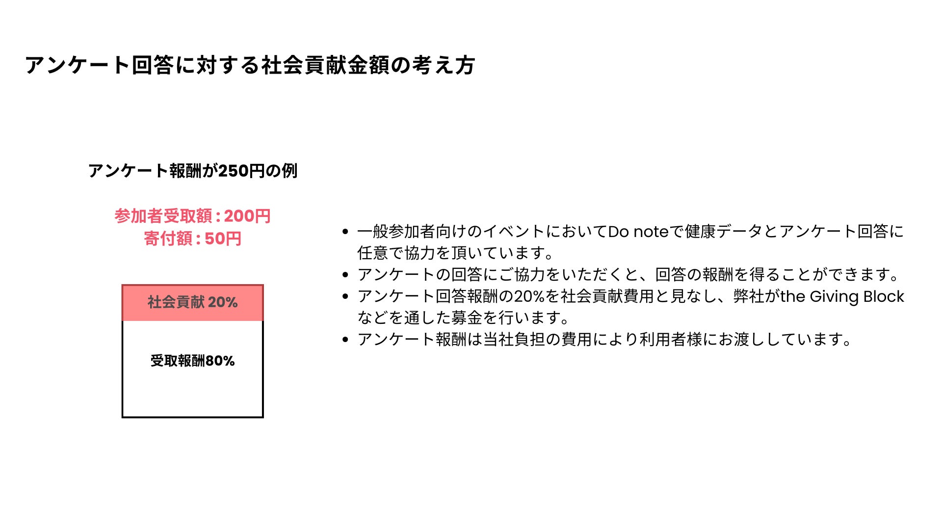 2024年6月からの新しい取り組みとして、お客様の健康データ記録とアンケート回答頂いたことに対する謝礼金額の20%を寄付に当てる金額と見なし、その金額を当社からの負担とし、The Giving Blockを通したNPO/NGO団体へ定期的な寄付を開始いたしました。The Giving Blockなどのブロックチェーンを利用した寄付を行う価値を当社は下記のように考えております。