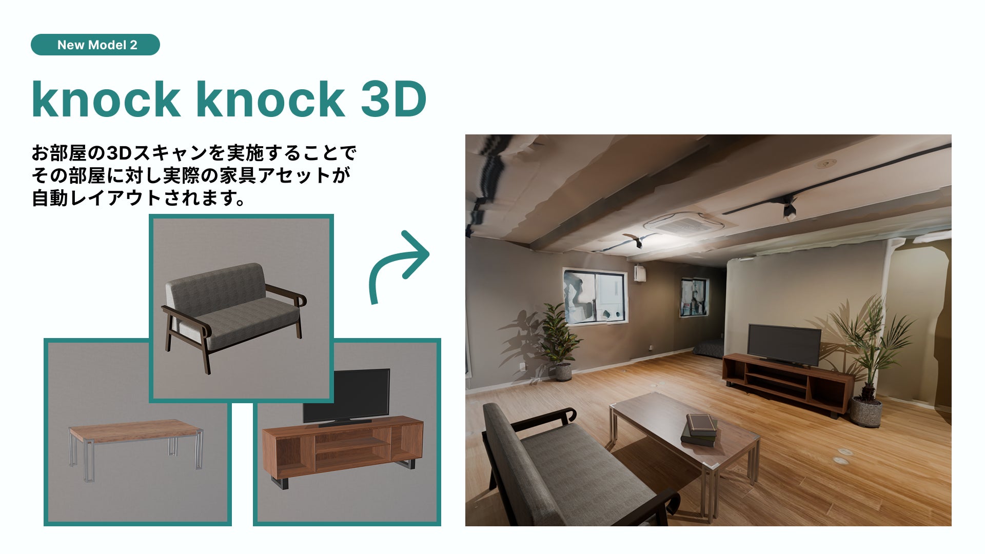 株式会社SAMURAI ARCHITECTS(本社:東京都、代表取締役:加藤利基、以下SAMURAI ARCHITECTS)は、当社が提供するAIホームステージングサービス「knock knock AI(ノックノックAI)」において、新機能となる2つのモデル「knock knock AI+」および「knock knock 3D」をリリースいたしました。今回の新モデル追加により、AIが生成したバーチャルな家具だけでなく実際に市販されている家具を配置したホームステージングが可能となり、より現実的で日本の生活様式に即した内装イメージを提案できるようになります。また、お部屋を3Dスキャンすることで実在する家具のレイアウトを自動生成し、ウォークスルー動画や高品質なステージング画像を出力する新サービスも提供開始し、不動産物件の訴求力向上に寄与してまいります。