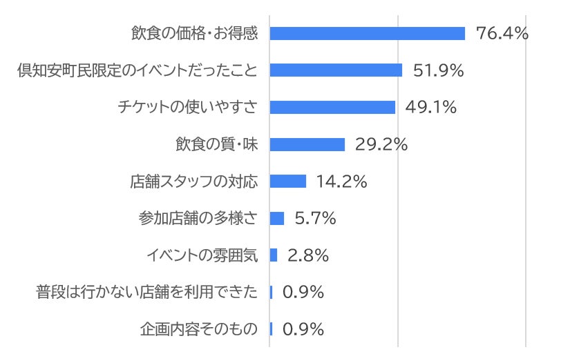 また、回答者からは「ホテルに併設されているお店は敷居が高いので行く機会がなかったが、イベントのおかげで思い切って出かけることができた」「高いと思っていたお料理もランチならリーズナブルだと知った」「冬の間は地元民が外食しづらいが、オフシーズンの企画は地元民として嬉しかった」等の意見が寄せられました。