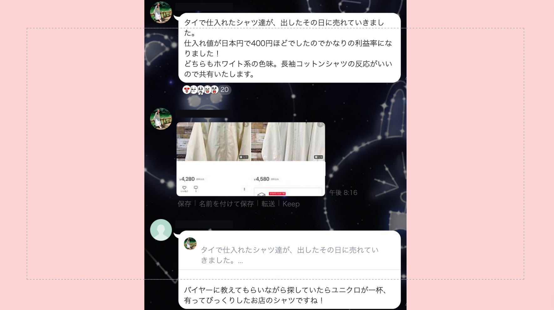 「市場での仕入を体験したり、現地バイヤーの方々のお話を聞けたり、、貴重な経験ができ知らない世界をたくさん見ることができました。今までやってきて古着の知識がなかなか身に入らず、売上も低くて成長が著しくない自分がタイで仕入れって大丈夫かな…と当初は思っていましたが自分自身にリセットかけるために参加して良かった。早速帰国して出品できるのが楽しみです!」