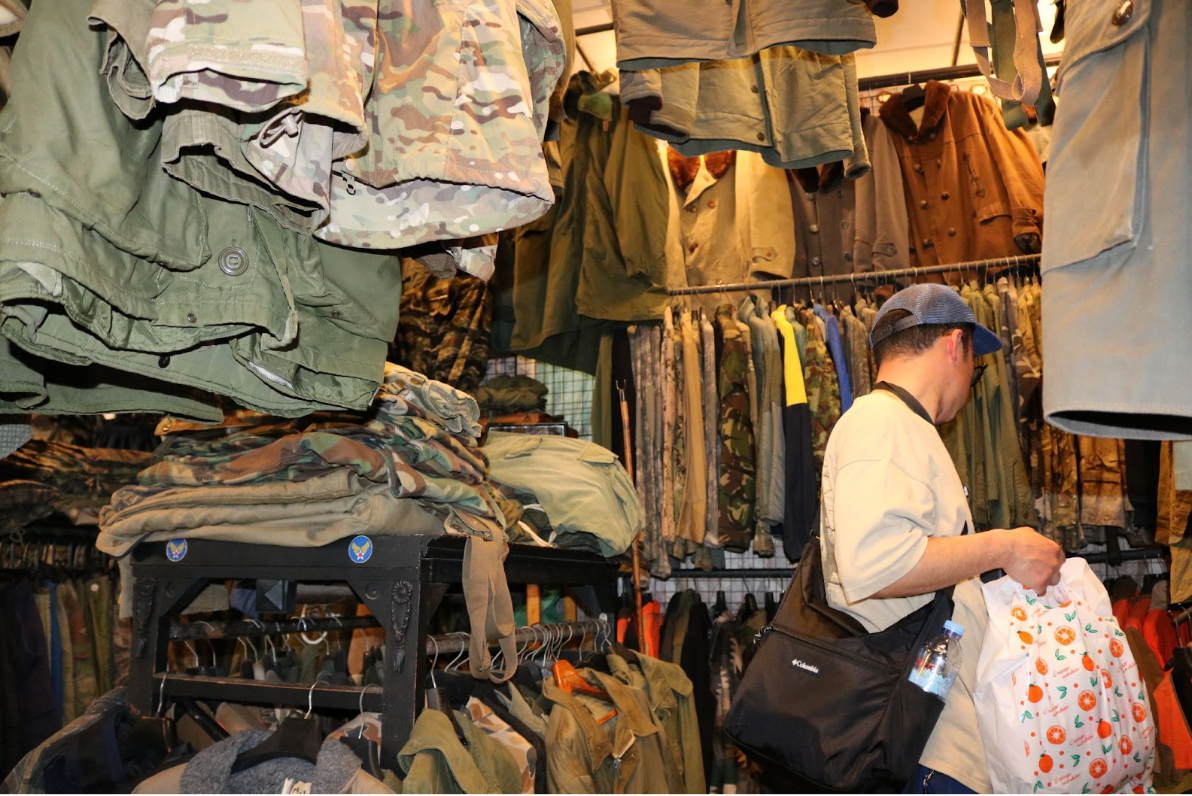 ベルギー軍のアイテムやスカジャンなど様々なジャンルの古着が揃い、古着バイヤー達は「これはヤバいですね!」と驚嘆している様子でした。