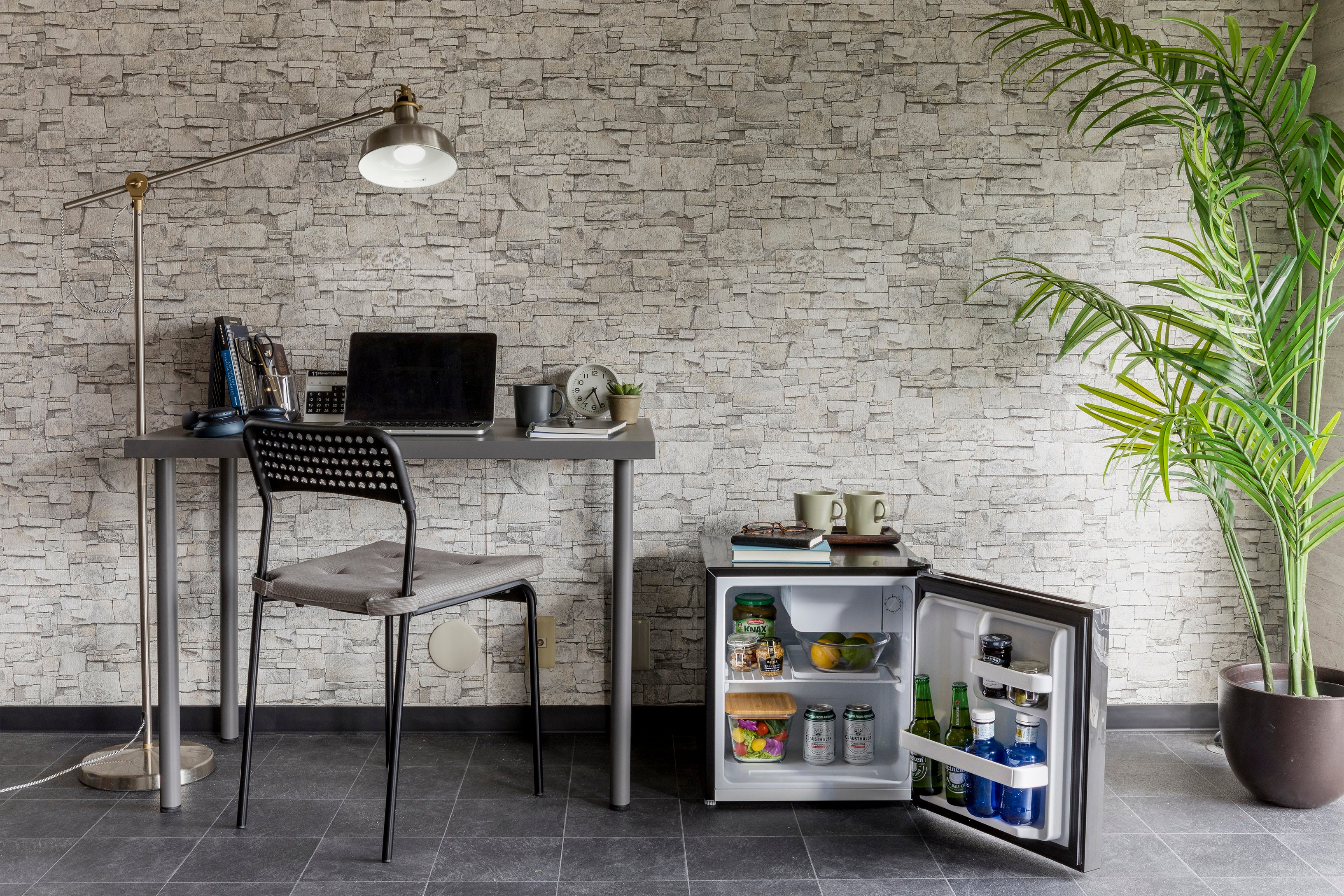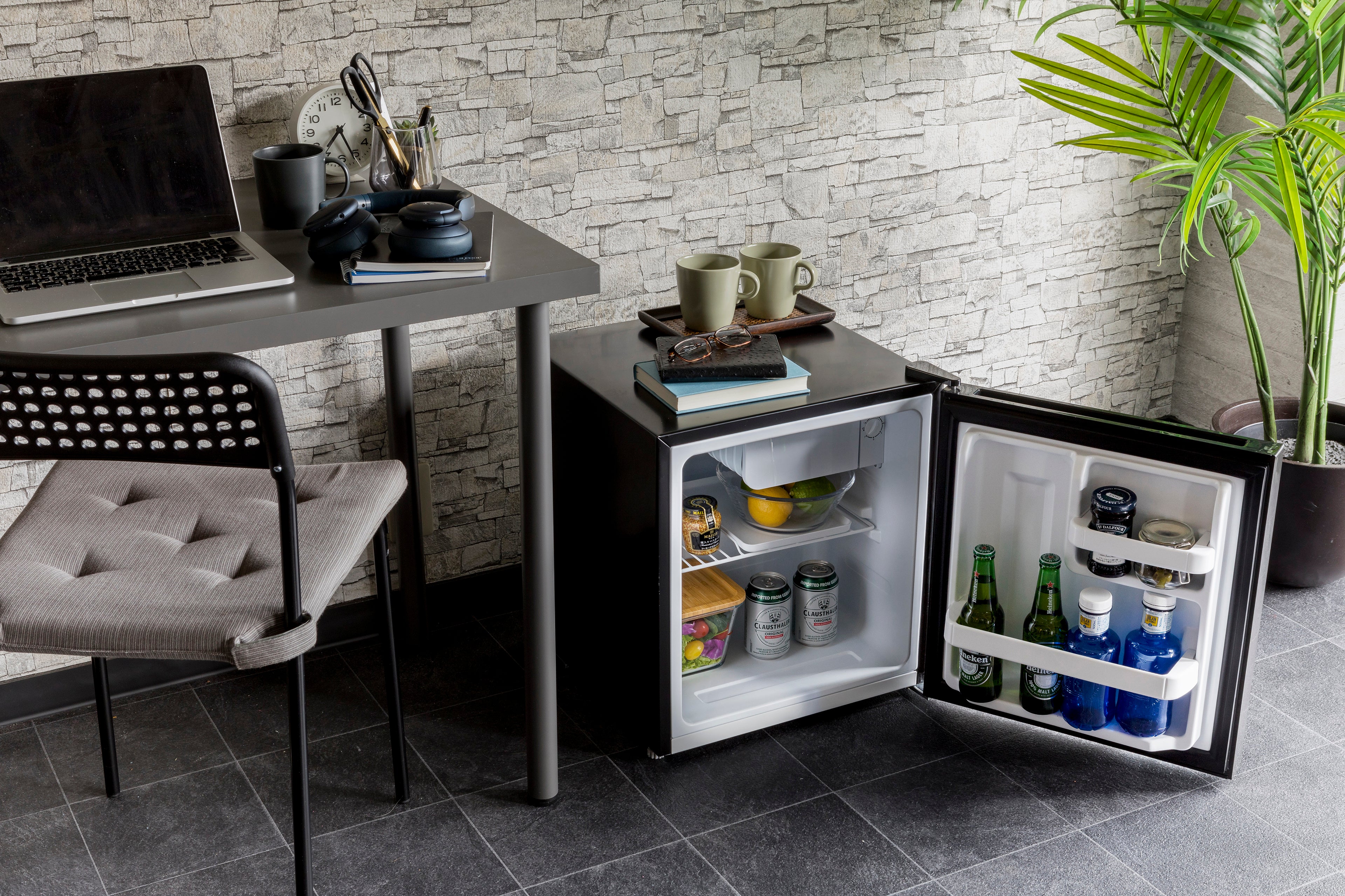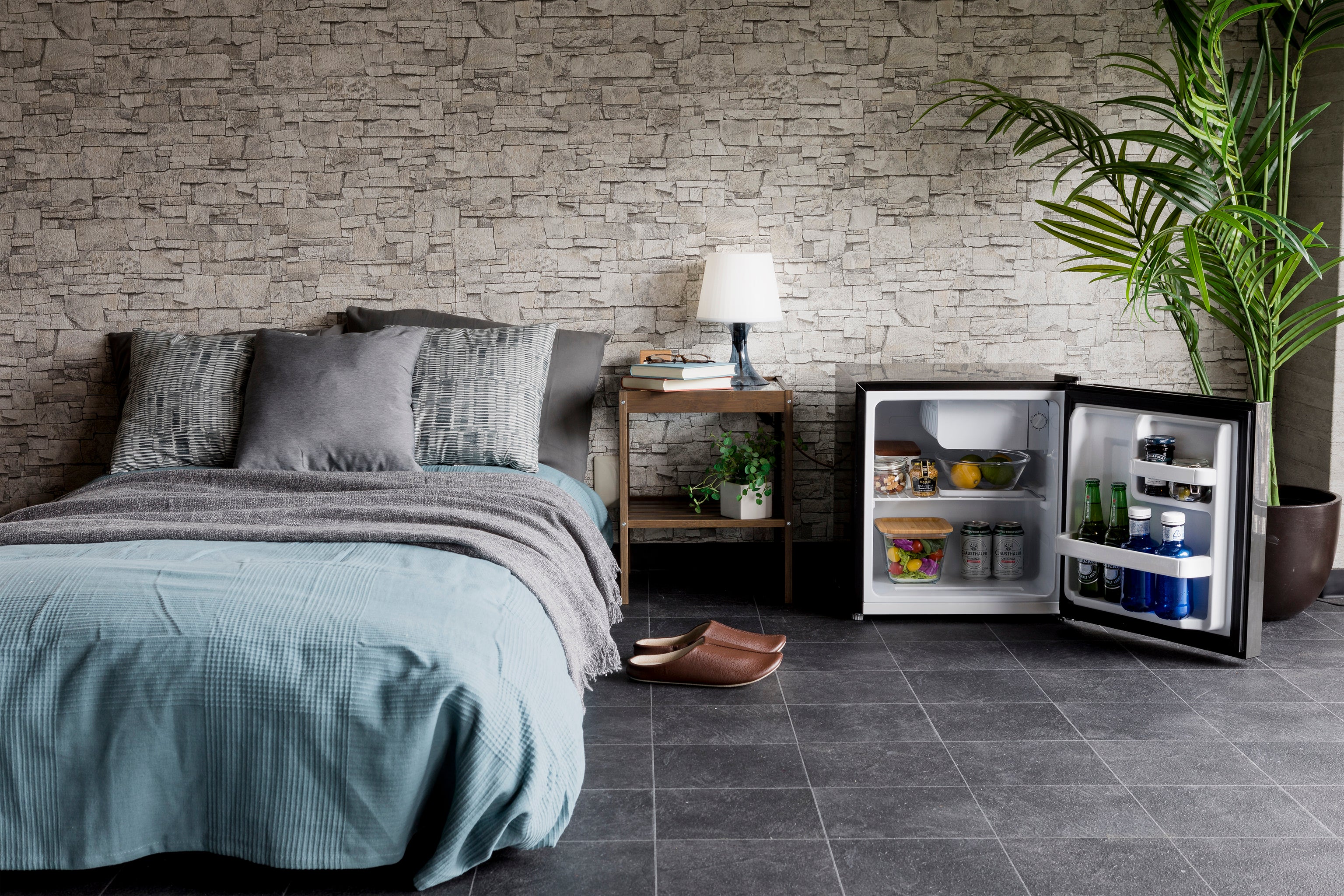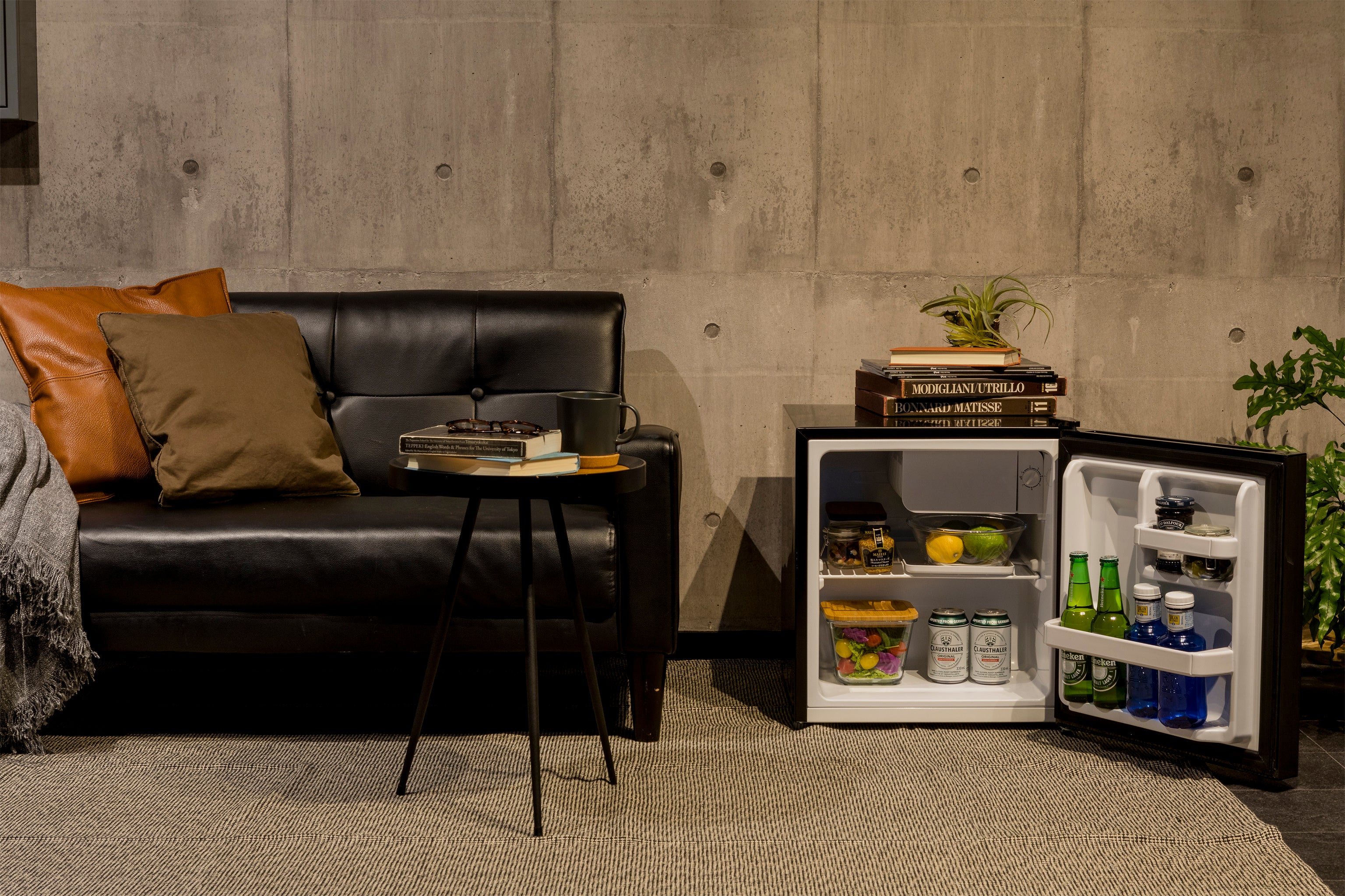 リビングや寝室などに設置しても、お部屋に馴染むスタイリッシュなデザインの小型冷蔵庫