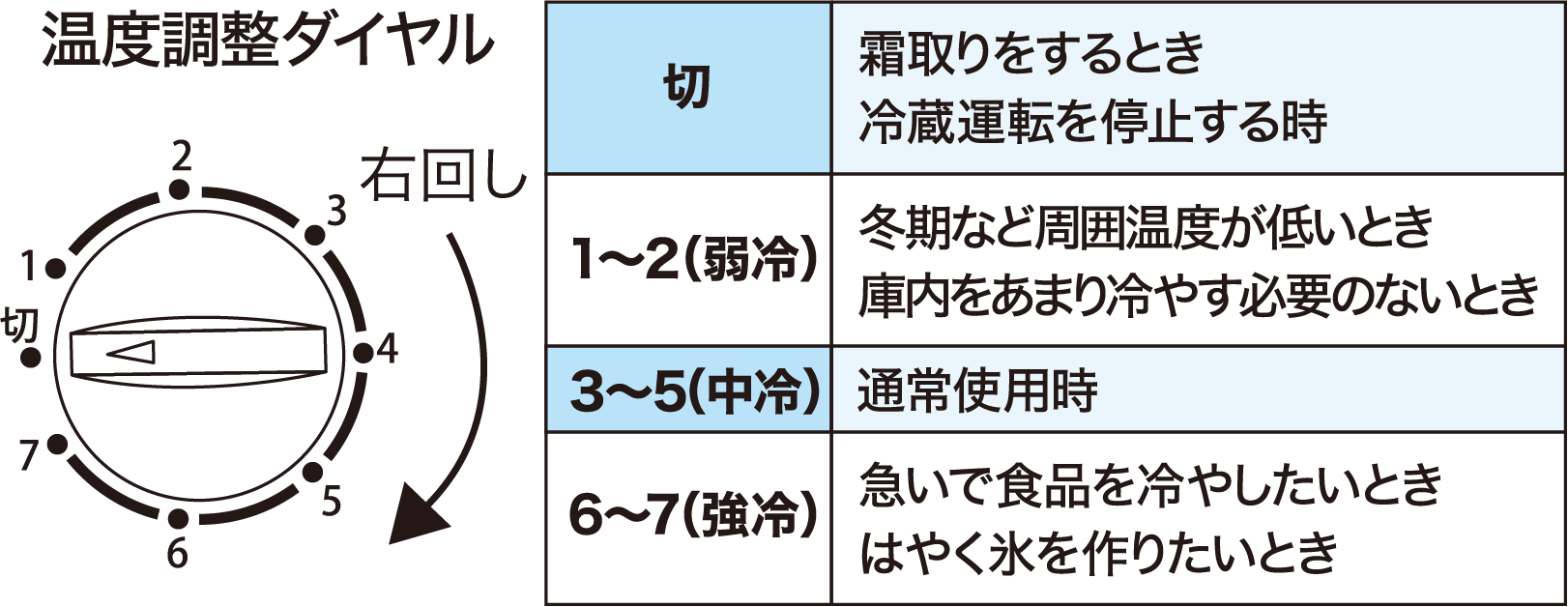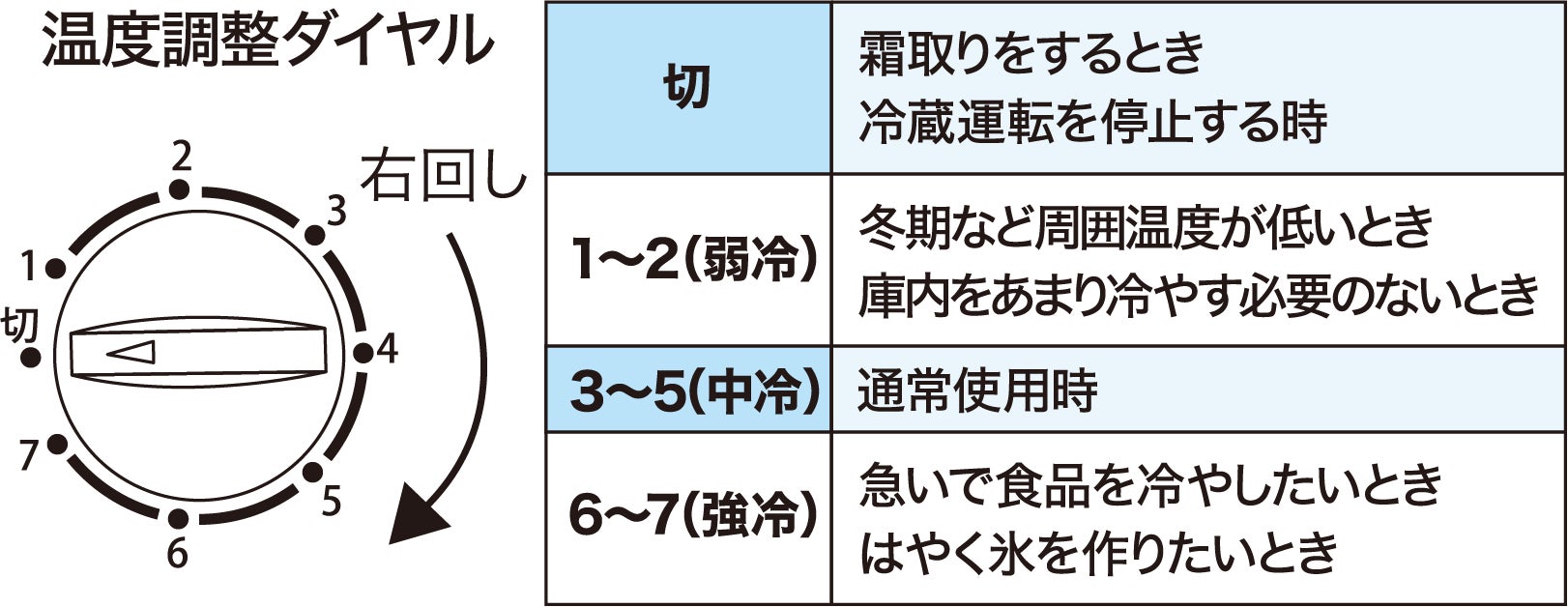 急速製氷、急いで食品を冷やしたい時は6〜7の強冷、通常時は3~5の中冷、庫内をあまり冷やす必要がない時は1〜2の弱冷等、細かく使い分ける事ができる。