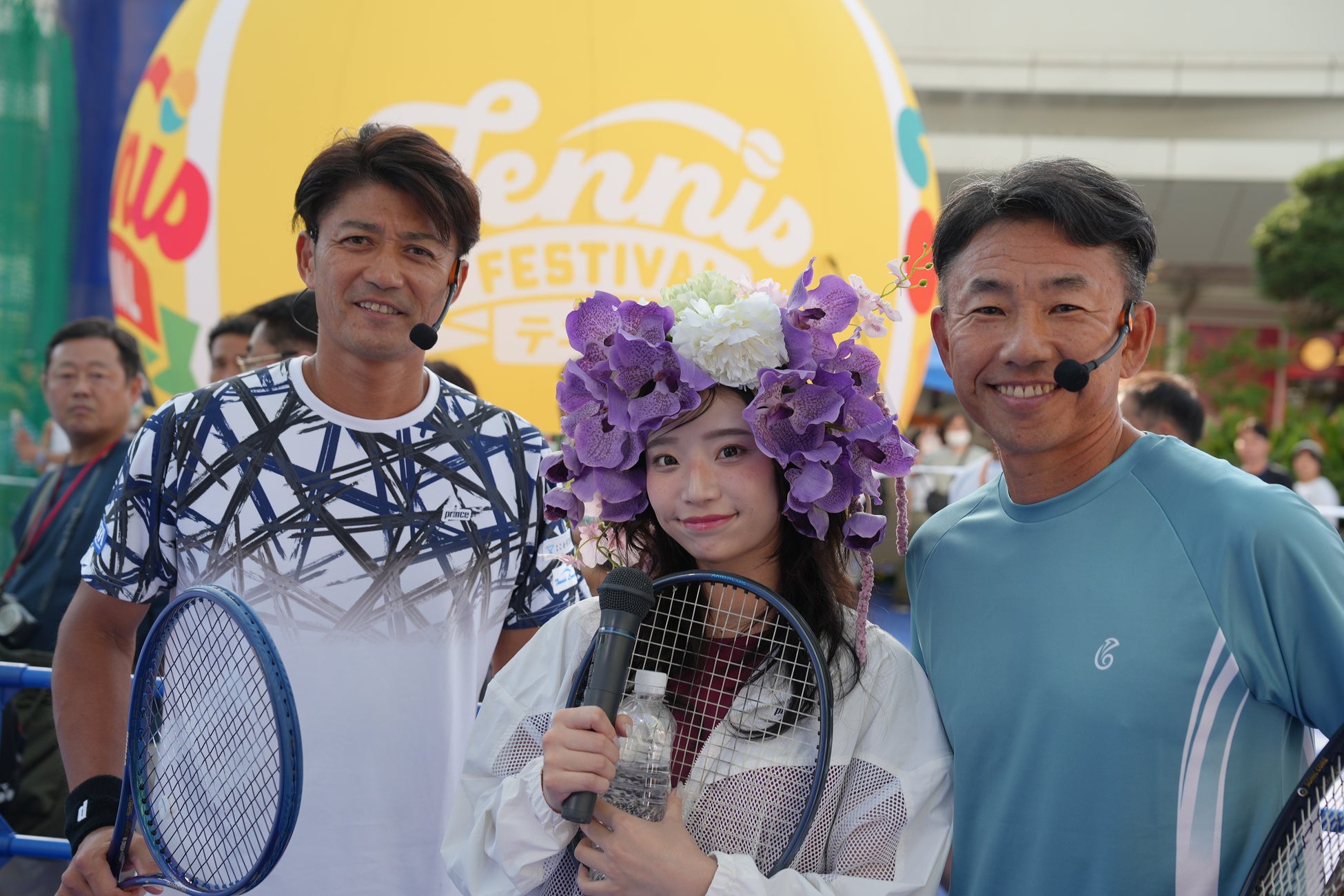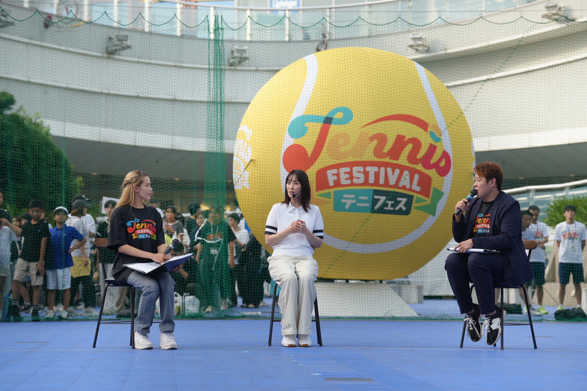 メインプログラムでは、タレントの坂下千里子さんが登場すると会場は笑顔に包まれました。テニス愛あふれるトークショーは終始和やかな雰囲気で進みました。