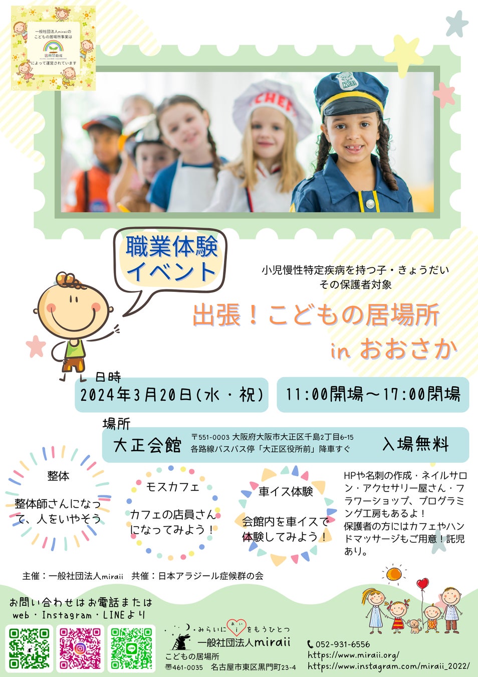 名古屋市東区で小児慢性特定疾病児とそのきょうだい児の居場所作り・学習支援を行っている一般社団法人miraiiが大正会館(大阪市大正区)で、ミライニアと題した対象児のための職業体験を行います。