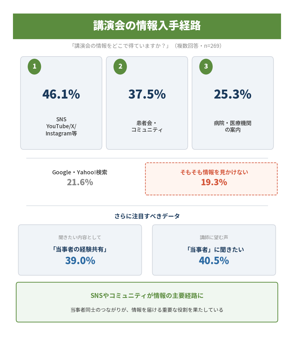 講演会の 情報入手経路: SNSと患者会 ‧コミュニティが上位に