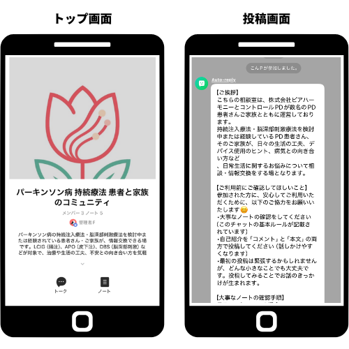 パーキンソン病患者さんの相談室は、パーキンソ ン病の持続注入療法‧脳深部刺激療法を検討中ま たは経験されている患者さん‧ご家族がご利用い ただけるオンラインのコミュニケーションの場で す。LINEを利用している方は匿名で無料参加が可 能です。 周囲に同じ病気の人がいないと「誰かに聞きた い」「どうすればいいの?」と感じた時、相談室 で気軽に相談することができます。 また特に投稿せず、日常生活の工夫‧ 就労の話‧ 便利グッズなど、知りたい情報を見ているだけの 患者さんも歓迎です。