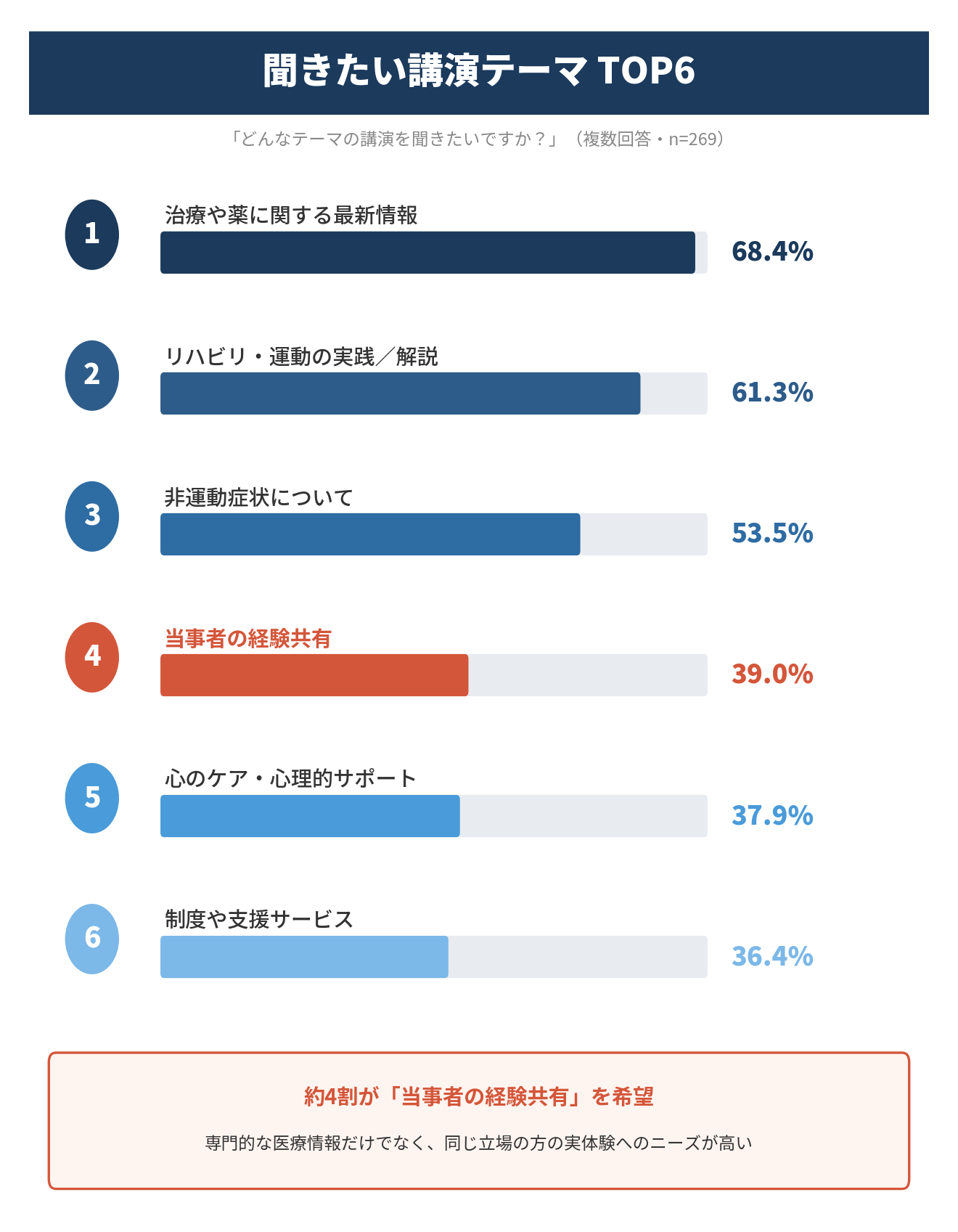 患者が最も講演で聞きたいテーマは「治療や薬に関する最新情報」(68.4%)で、次いで「リハビリ‧ 運動の実践/解説」(61.3%)、「非運動症状について」(53.5%)、「当事者の経験共有」(39. 0%)、「心のケア‧心理的サポート」(37.9%)、「制度や支援サービス」(36.4%)と続きまし た。専門的な医療情報に加え、同じ立場の方の実体験を聞きたいというニーズの高さが確認されまし た。