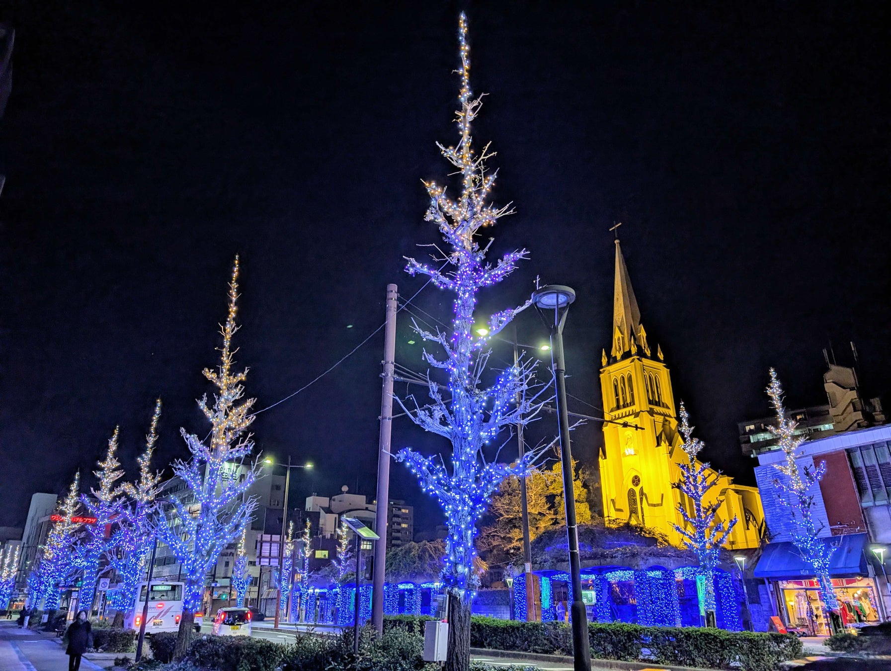 ・黄色の「夜にときめく ドリームコラージュ」:西鉄久留米駅前交差点~東町4丁目交差点、シティプラザ東交差点~六ツ門交差点