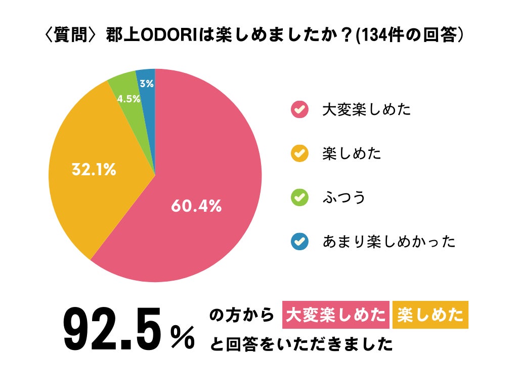 女性・40代|本物のお囃子に合わせて踊るのは楽しかったです。踊りの上手な方々は、浴衣が揃い、素敵でした。子どもが生まれる前は徹夜踊りによく行っていたので懐かしかったです。今度は子供を連れてぜひ郡上市に踊りに行きたいと思います。またこのようなイベントを実施してほしいです‼︎