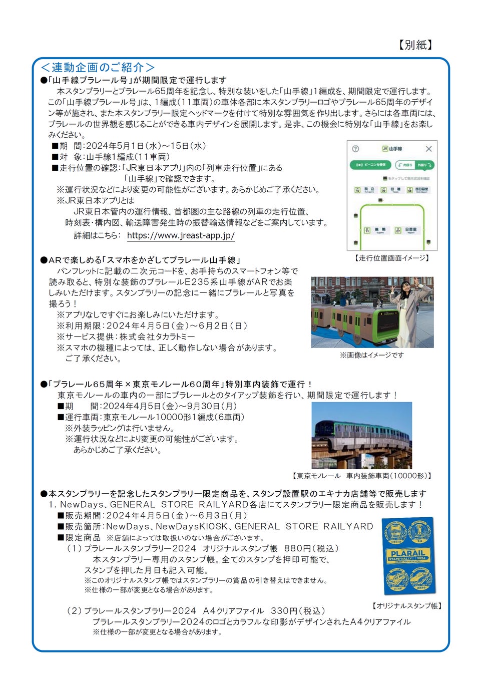 ○開催期間中には、特別なヘッドマークを付けた「山手線プラレール号」の運行や、スタンプ設置駅のエキナカ店舗・駅ビルなどで、スタンプラリーと連動した限定商品の販売なども実施します。
