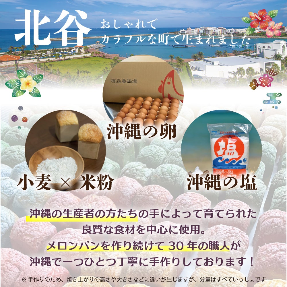 北谷メロンパンは、ブリオッシュ風のパン生地に、サクサクのビス生地で仕上げた手作りメロンパン。沖縄を感じる色彩は、ハイビスカスやバタフライピーなど沖縄の生産者さんが作るこだわりの食材の色。安心できる素材を使用しているから、“賞味期限はたったの1日”!Re:MELO(リメロ)の「焼きたて北谷メロンパン」は、普段はアメリカンビレッジのお店で販売中。沖縄にお越しの際は是非お立ち寄りください。