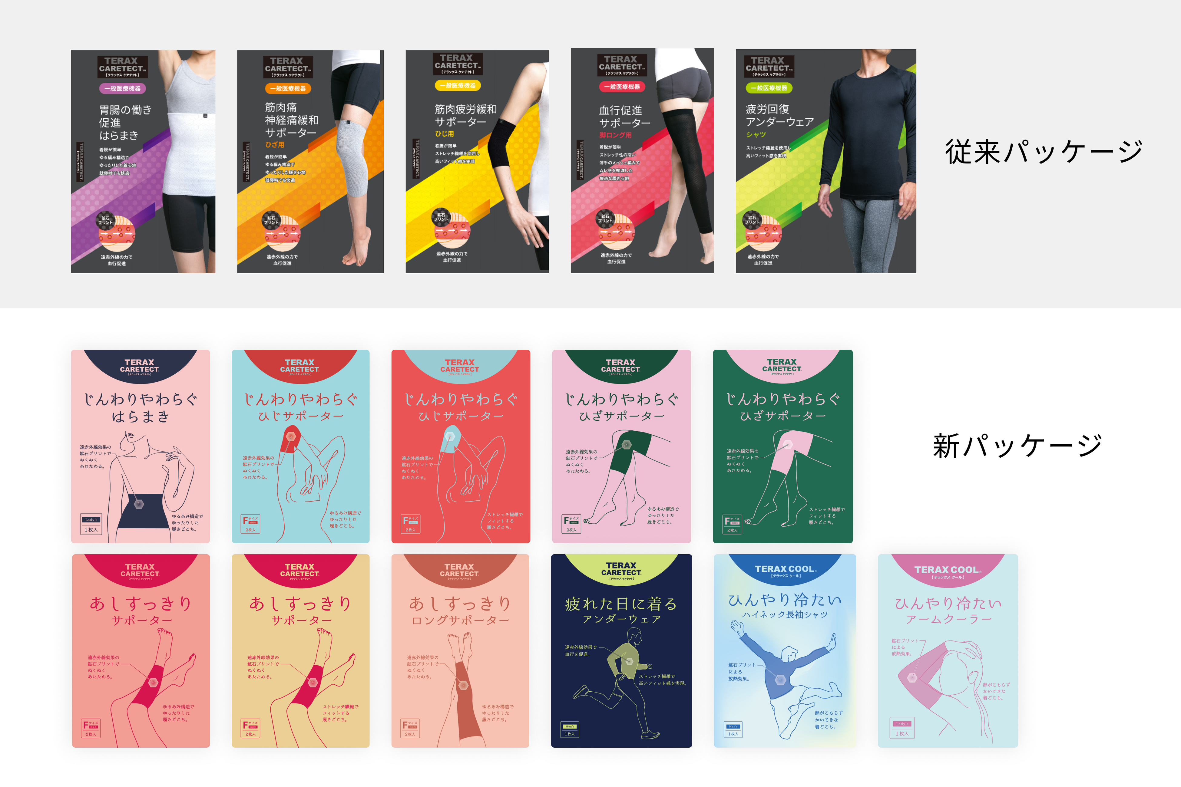 当社がブランド支援をしている「TERAX」。そのなかでも、今回の「TERAX CARETECT」シリーズはサポーターやはらまきなど「TERAX」の持つ高機能な素材の力を最大限に発揮することが可能です。ケアサポートラインは、ユーザーのみなさまにより身近に愛される商品にしたいという東光商事株式会社様の想いを受け、構想からリニューアルしたブランドラインとなります。