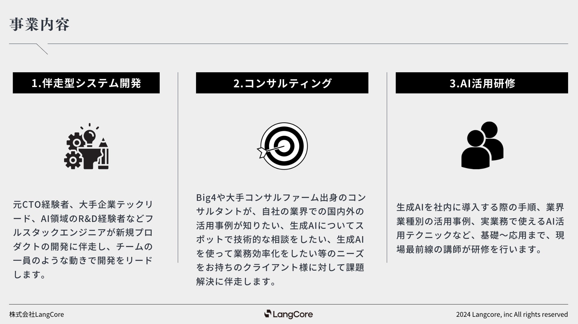 LangCoreは2023年に設立以来、生成AI技術を駆使したシステム開発およびAI活用コンサルティングサービスを展開し、特に生成AI技術を中心に多くの企業の業務効率化や新たなビジネス創出を支援することでクライアント企業のニーズにお応えしてまいりました。