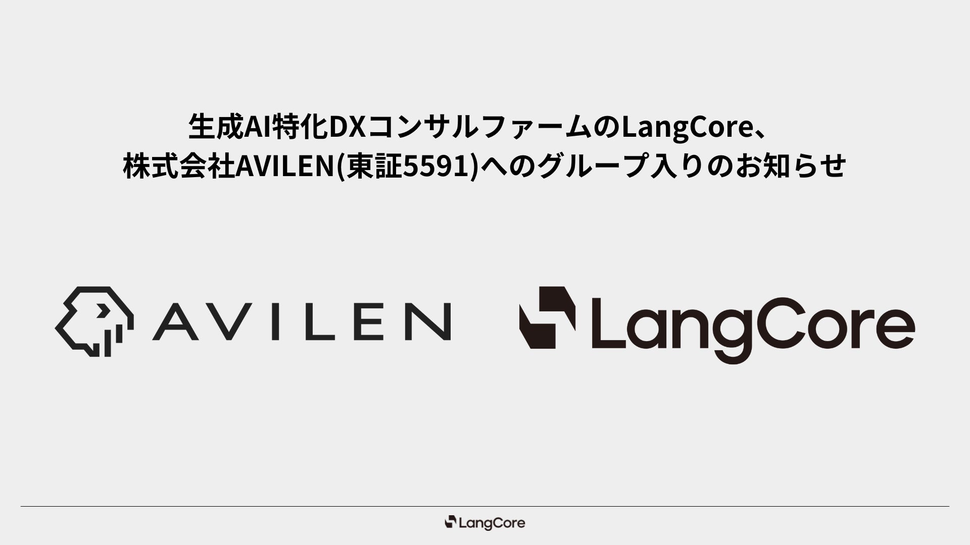 株式会社LangCore(本社:東京都江東区、代表取締役:高木陽介/北原麦郎、以下「LangCore」)は、株式会社AVILEN(本社:東京都中央区、代表取締役:高橋 光太郎、以下「AVILEN」)とのM&Aに合意し、2024年10月11日よりAVILENグループに子会社として参画したことをお知らせします。