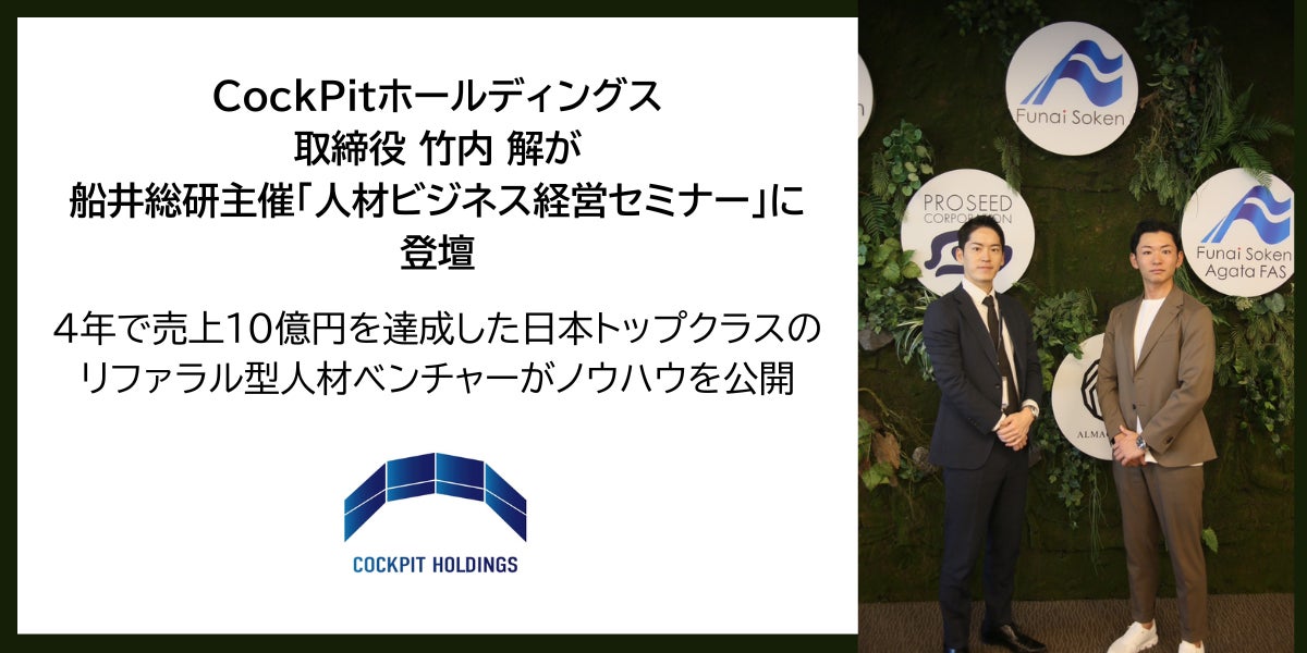 株式会社CockPitホールディングス(本社:東京都港区、代表:鯰江純樹、以下CockPitホールディングス https://cockpit-tokyo.com/)は、2025年11月に東京と大阪で開催される船井総合研究所主催「人材ビジネス経営セミナー 」にて、特別講演を行います。本講演では、同社が手がけた「広告費ゼロ・紹介100%」を実現した独自の採用戦略・集客戦略と、わずか4年間で売上10億円を達成した事業成長のプロセス、社員リファラル採用の秘訣を、ノウハウとともに紹介します。