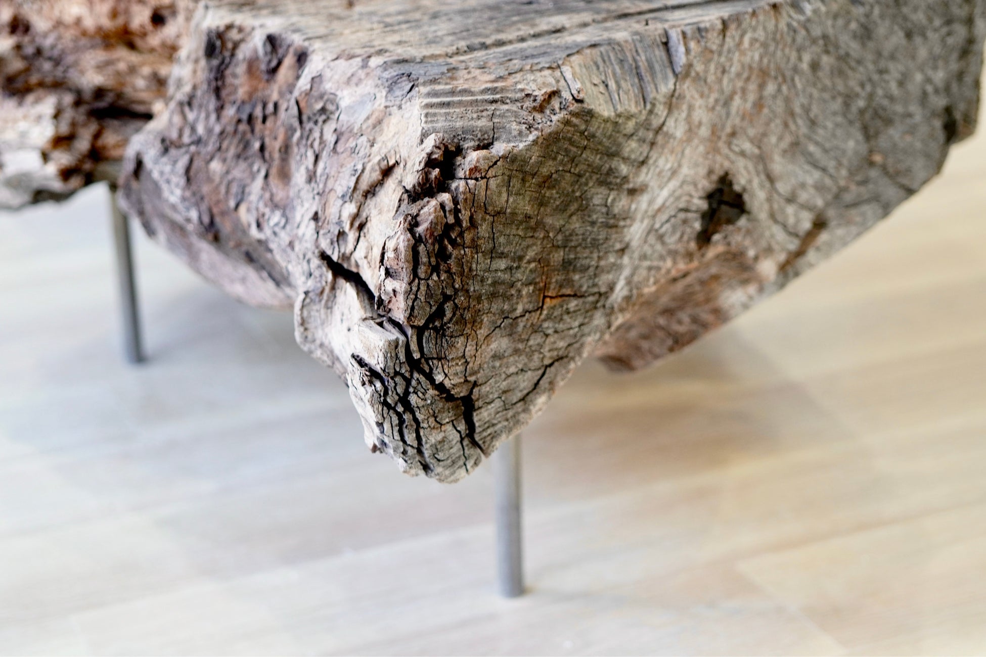 銘木問屋さんと金物屋さんで、大きさとユニークな形により使い道のなかった木と金属に出会い、テーブルを作りました。