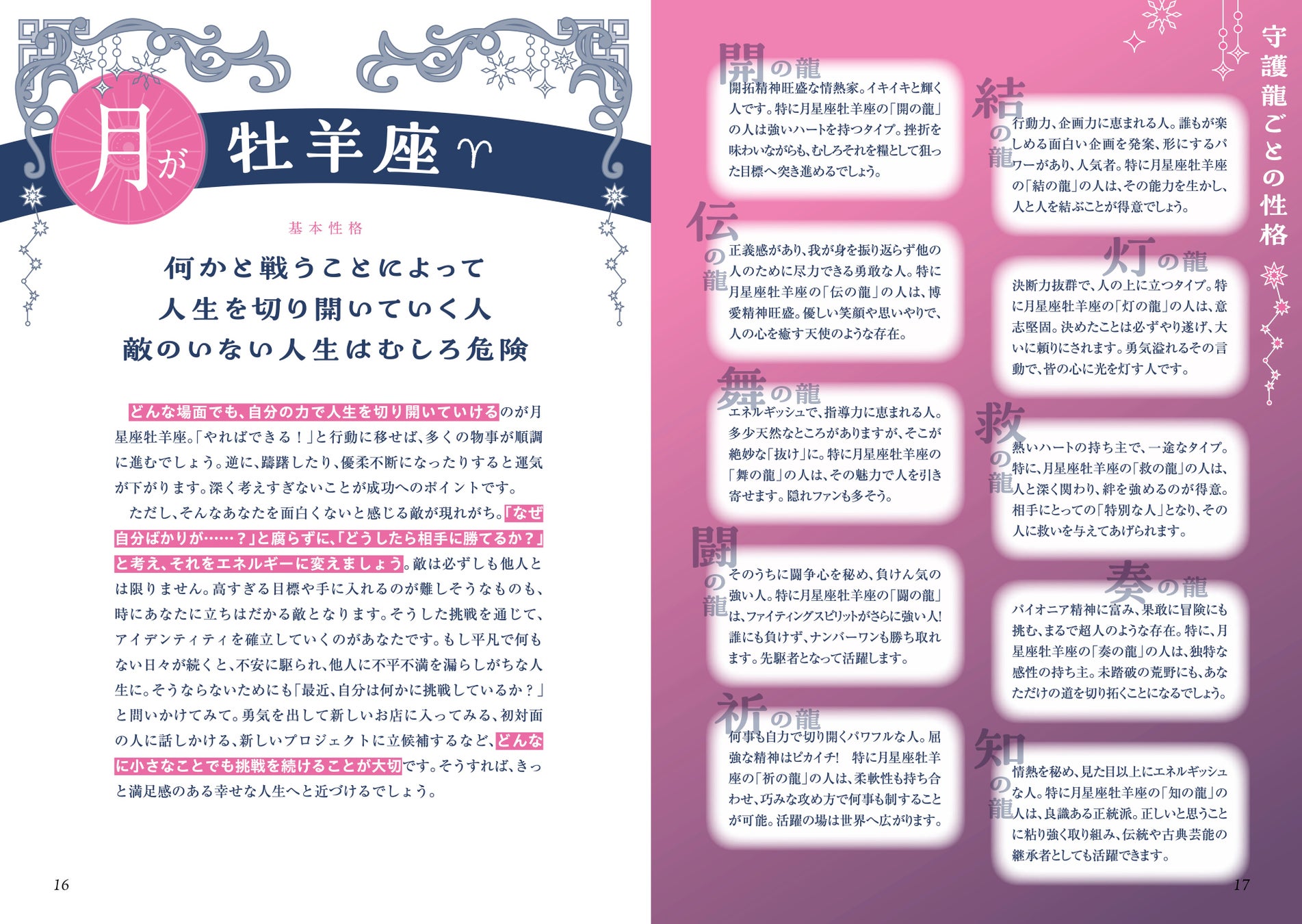 この本では、「月星座&守護龍」を組み合わせたそれぞれの性格の傾向、2025年の恋愛、健康、仕事運、金運、ラッキーアイテムを解説しています。また、家の風水もご紹介。