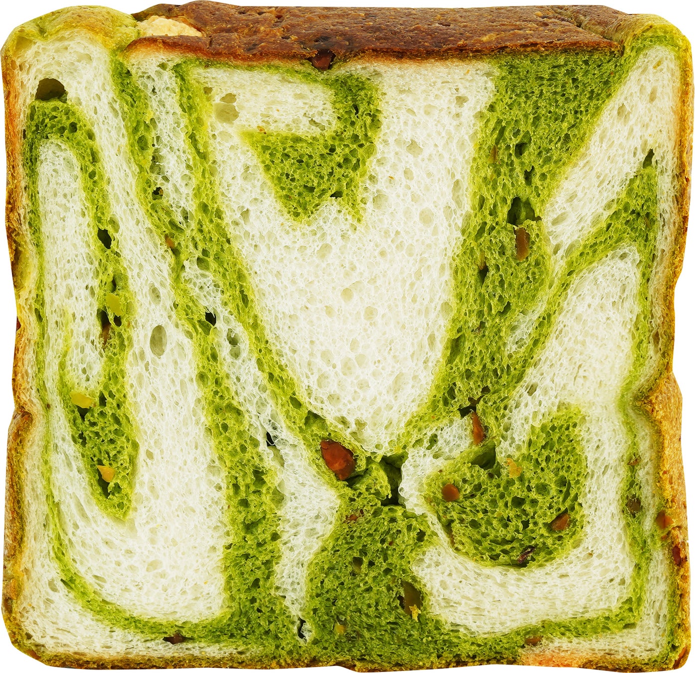 嵜本ベーカリーのオリジナルピスタチオジャムを塗って追いピスタチオにしてもお勧めです。グリーン&ホワイトのマーブルが色鮮やかな、コントラストも美しい1ヶ月限定食パンです。