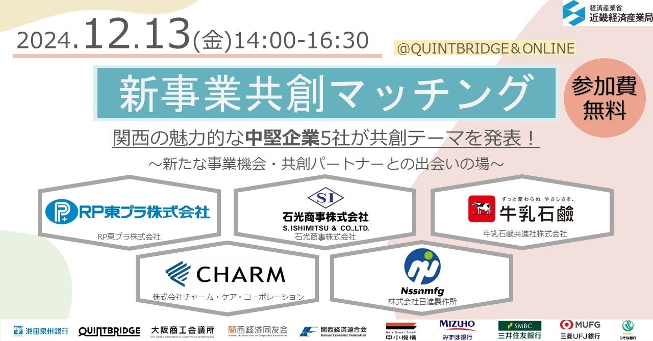地域未来牽引企業をはじめとする関西の成長志向の高い中堅企業5社が登壇し、多様な共創テーマを発表するマッチングイベント「新事業共創マッチング」を開催します。
