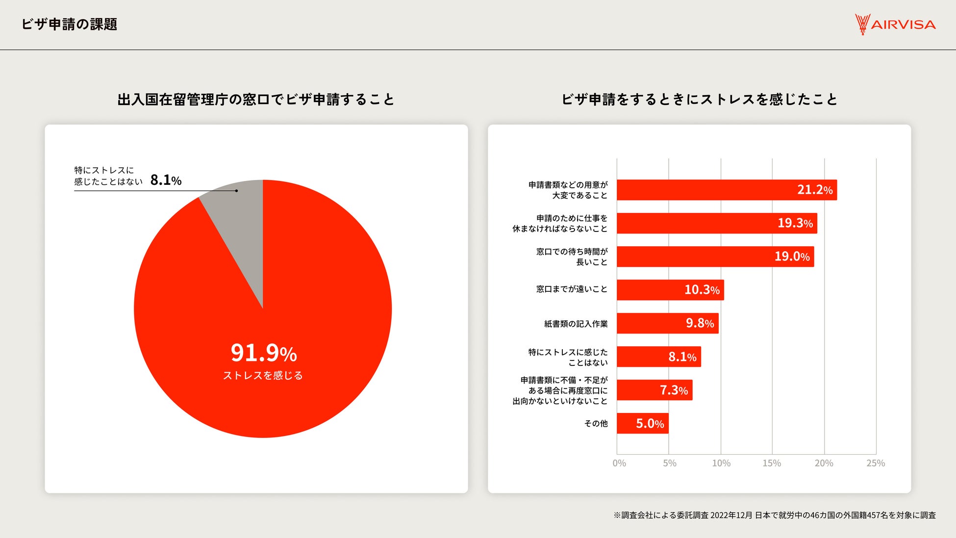 「AIRVISA」の開発時に実施した外国籍の方へのアンケートによると、9割を超える方が窓口でのビザ申請にストレスを感じていることが明らかになりました。