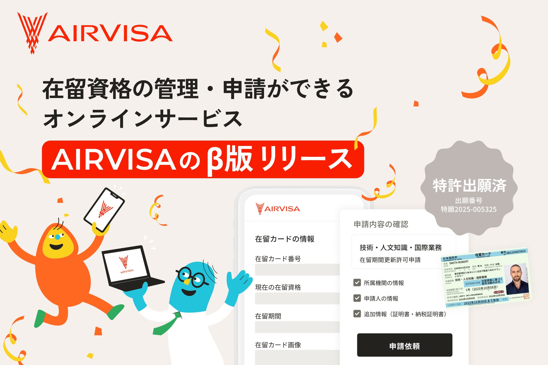 株式会社AIRVISA(本社:東京都港区、代表取締役CEO:ジャファー アフメット、以下「当社」)は、ビザ(在留資格)管理・申請オンラインサービス「AIRVISA」β版の提供を開始しました。