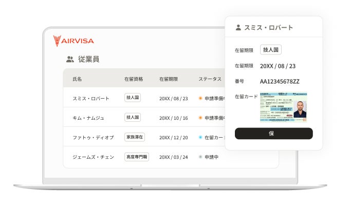 AIRVISAは、いつでもどこでもかんたんにビザ(在留資格)管理・申請ができるオンラインサービスです。外国籍の方はもちろん、所属先の企業や団体の方にとっても、在留資格の申請手続きに関わるプロセス全体の負担を軽くします。