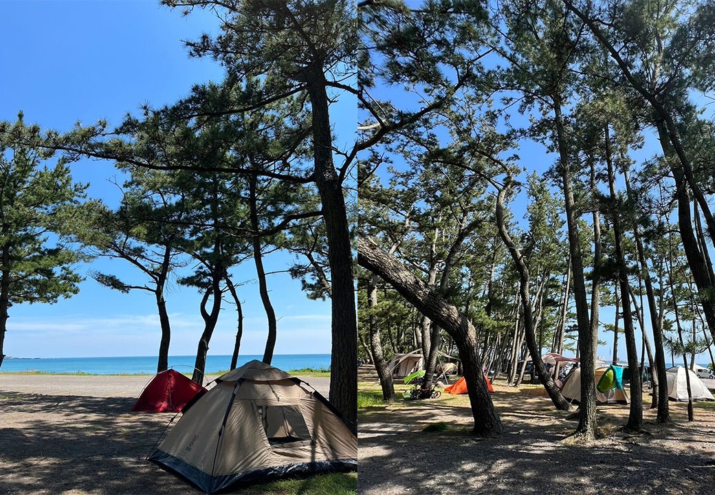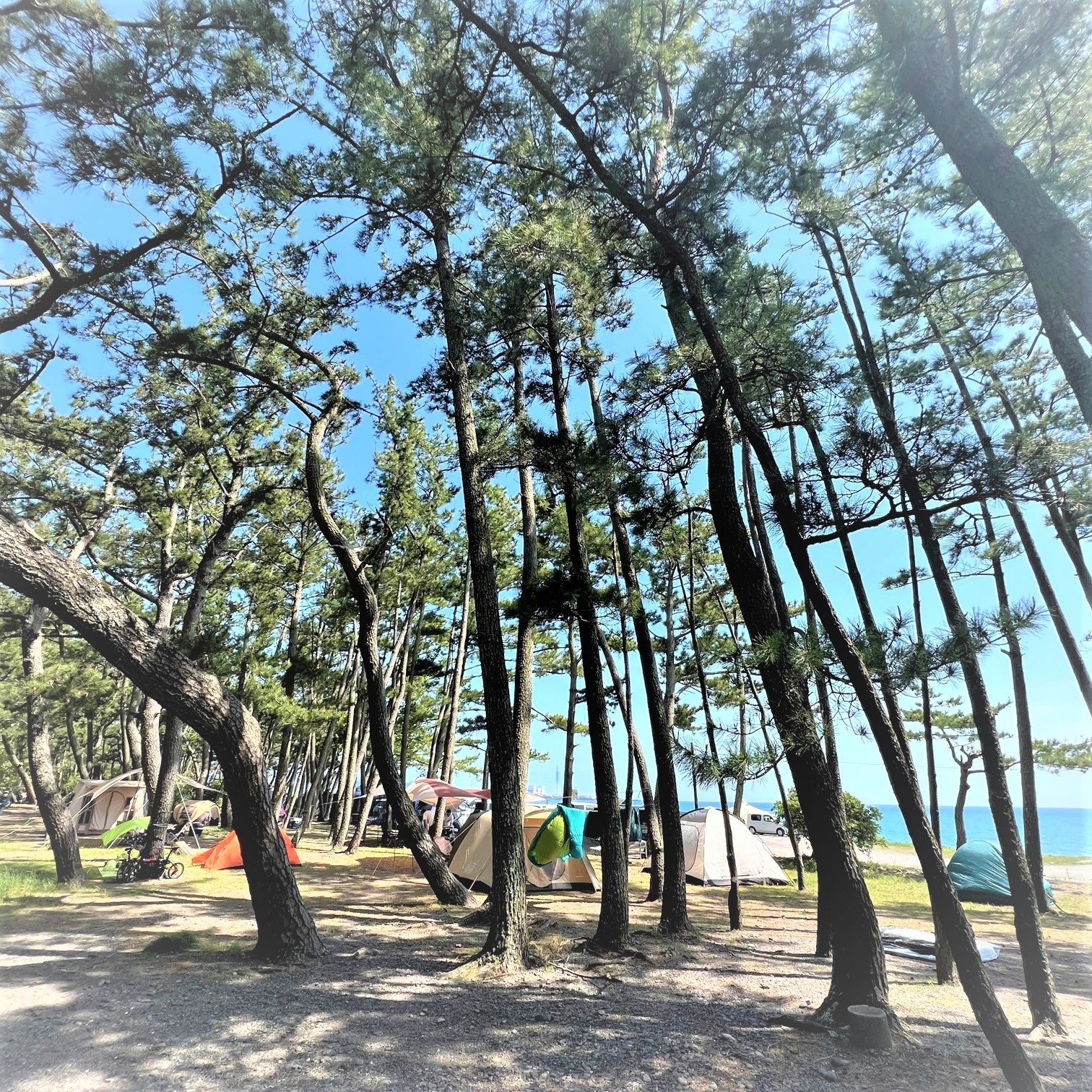 キャンプ場には珍しい海が目の前に広がるキャンプ場「煙樹海岸(えんじゅかいがん)キャンプ場」。ここから見る夕日は格別です。キャンプ場は江戸時代からある長さ4.5キロメートルに及ぶ大松林の中にあります。※煙樹海岸の大松林は「21世紀に引き継ぎたい日本の名松百選」に選ばれている。