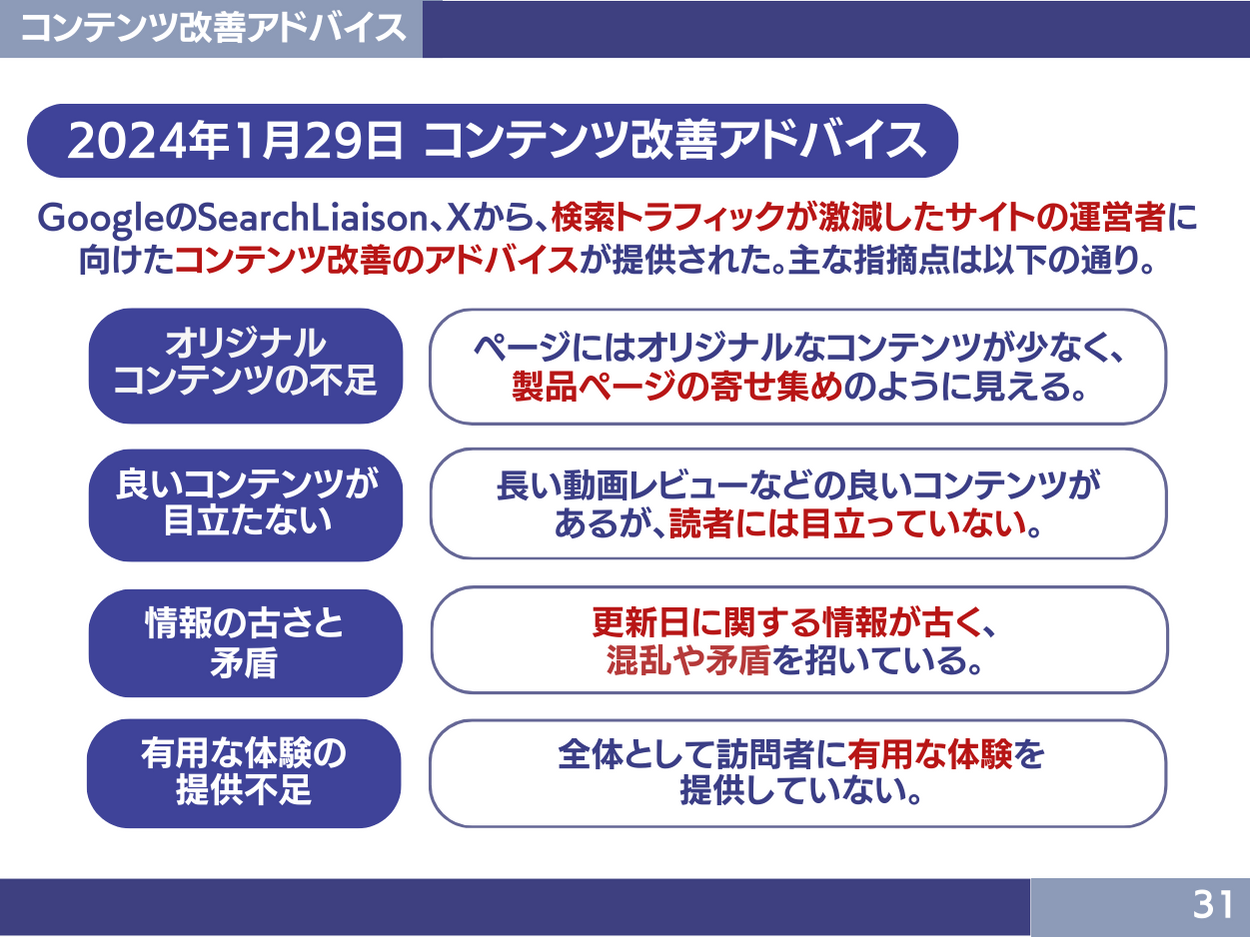 Googleの公式Xでは、検索トラフィックが激減したサイトの改善点を以下のように指摘しています。