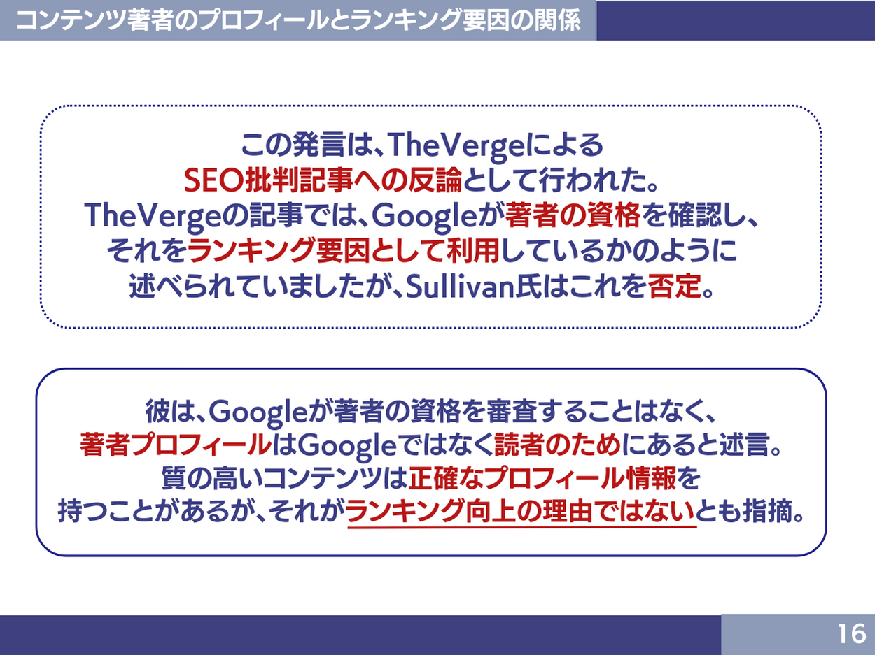 コンテンツ著書のプロフィールは「ランキング向上の直接的な理由とはならない」とSullivan氏が指摘しましたが、間接的なランキング向上の要因にはなりえると言及しています。コンテンツ著者のプロフィールがどのように間接的にランキングに影響するのか、本レポートを通して理解を深めていただけます。