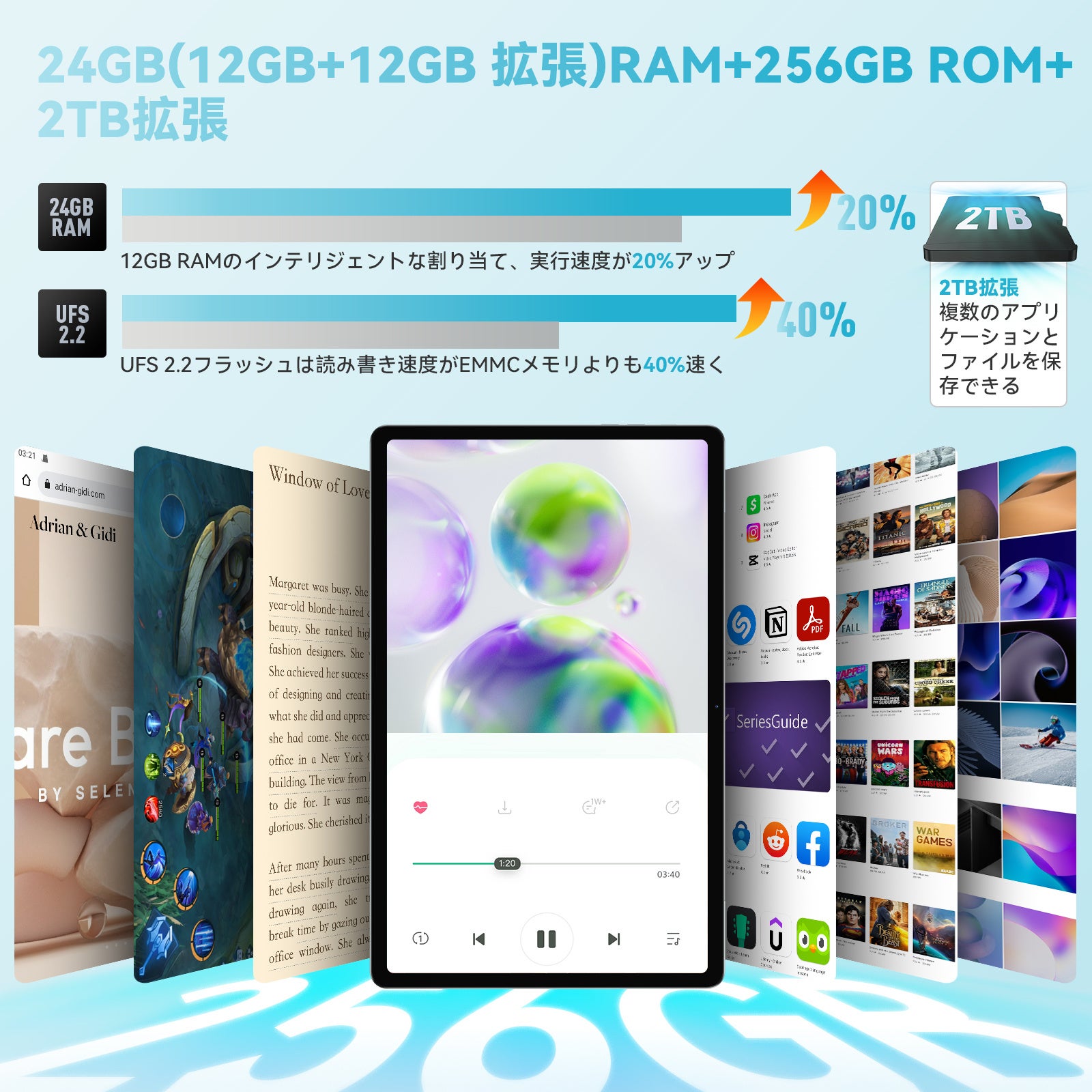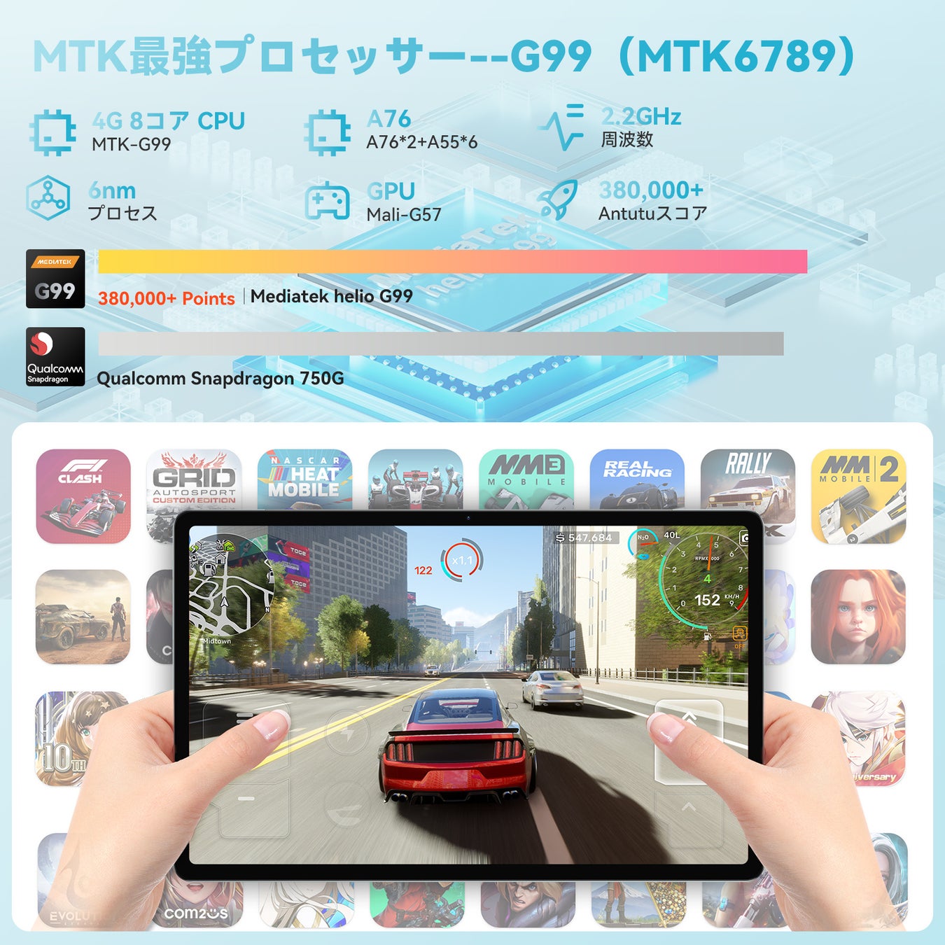 8コアのフラッグシップチップMTKのG99、本格の12GBのDDR4X規格のRAM、仮想メモリには最大12GBまで拡張、256GBのUFS 2.2規格のROM、11インチFHDディスプレイ、8500mAhの大容量バッテリー、30Wの超高速充電、TÜVの低ブルーライト認証などのハイスペックがあり、AnTuTuのスコアは420,000+に達します。