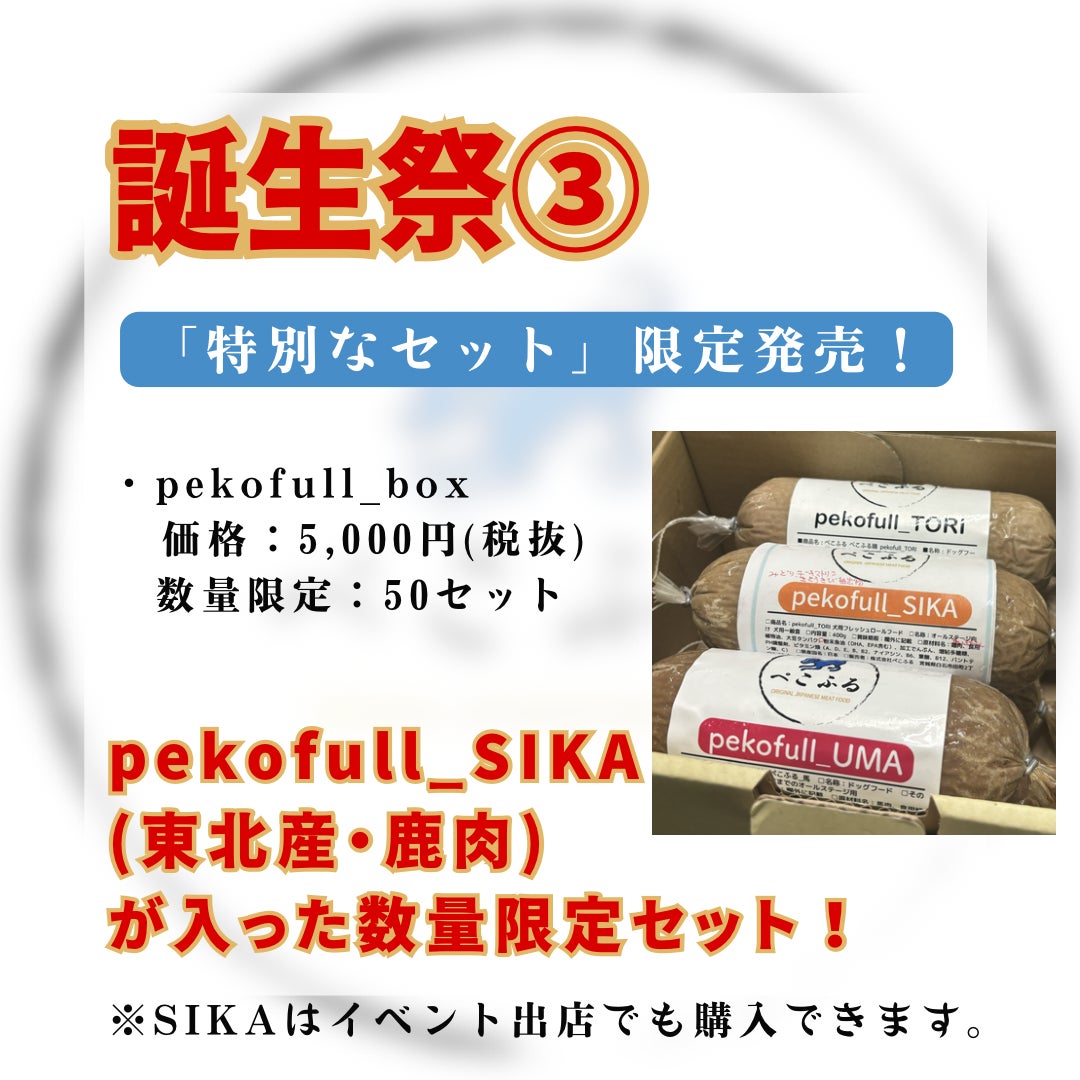 フレッシュペットフード「ぺこふる」(pekofull)を提供する株式会社ぺこふる(代表取締役:菊地諒、本社:宮城県白石市、以下当社)は、2024年6月19日(水)に創業1周年を迎えました。これを記念して、公式オンラインショップにて「誕生祭」を開催しております。東北産原料にこだわったフレッシュロールフード(冷凍タイプのロール状ドッグフード)の特別セールのほか、既に発売している鶏肉・馬肉のごはんに加え、今回初お披露目となる新商品第3弾”pekofull_SIKA”がセットになった特別な3本セット「pekofull_BOX」を期間限定にて販売しております。使うお肉をヒューマングレードな東北産に限定し、犬本来の主食である生肉に近い水分量を食べごたえにこだわり製造した、食いつき抜群の愛犬ごはんです。公式オンラインショップ(https://pekofull.myshopify.com/)にて販売中。