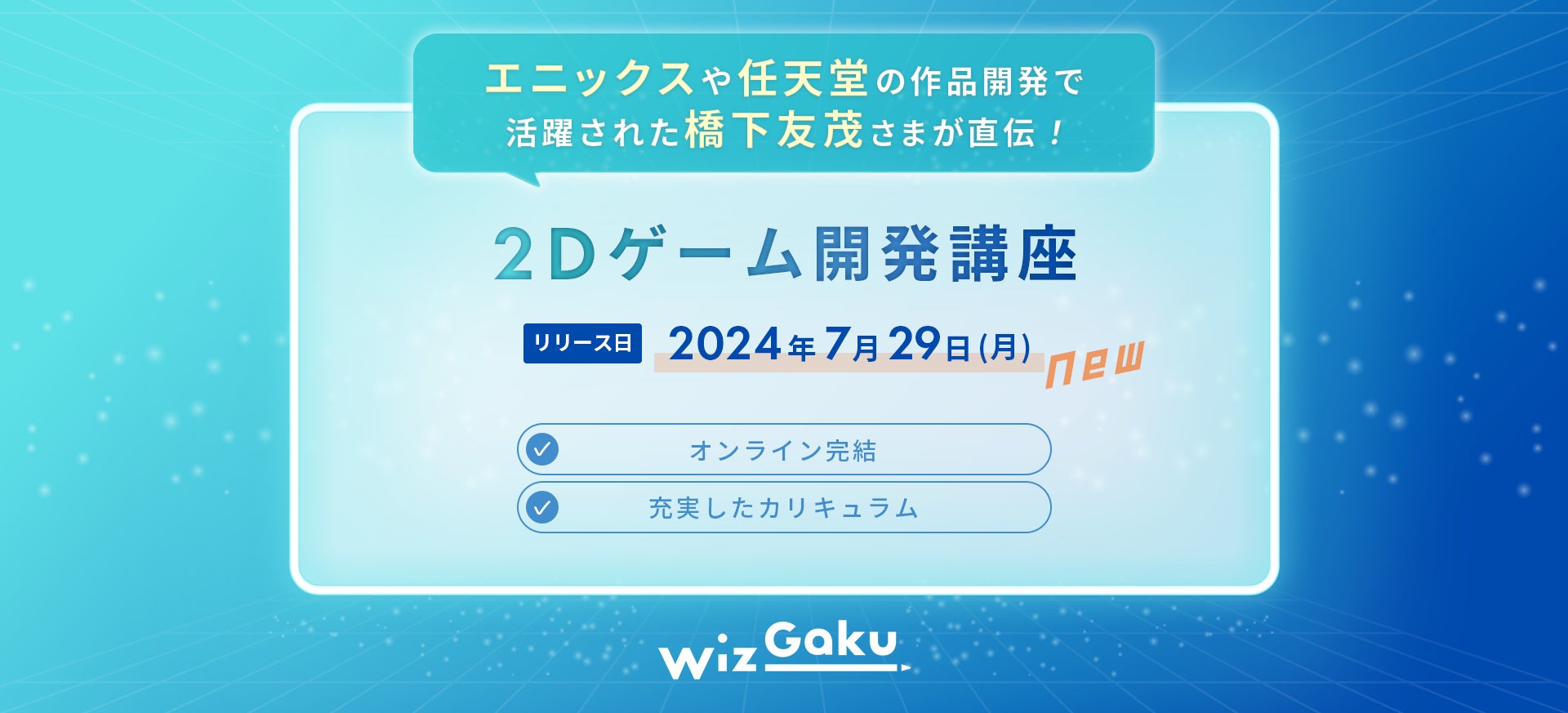 株式会社ウィズテック(本社:東京都中央区 代表取締役:日向 亮介)は、「WizGaku eラーニング」で、新たに「ウェブデザイナー講座」と「2Dゲーム開発講座」をリリースしました。現在、各コンテンツは先着100名限定でリリースキャンペーンも開催中です。詳細情報やお問い合わせは、以下のサービスサイトをご覧ください。