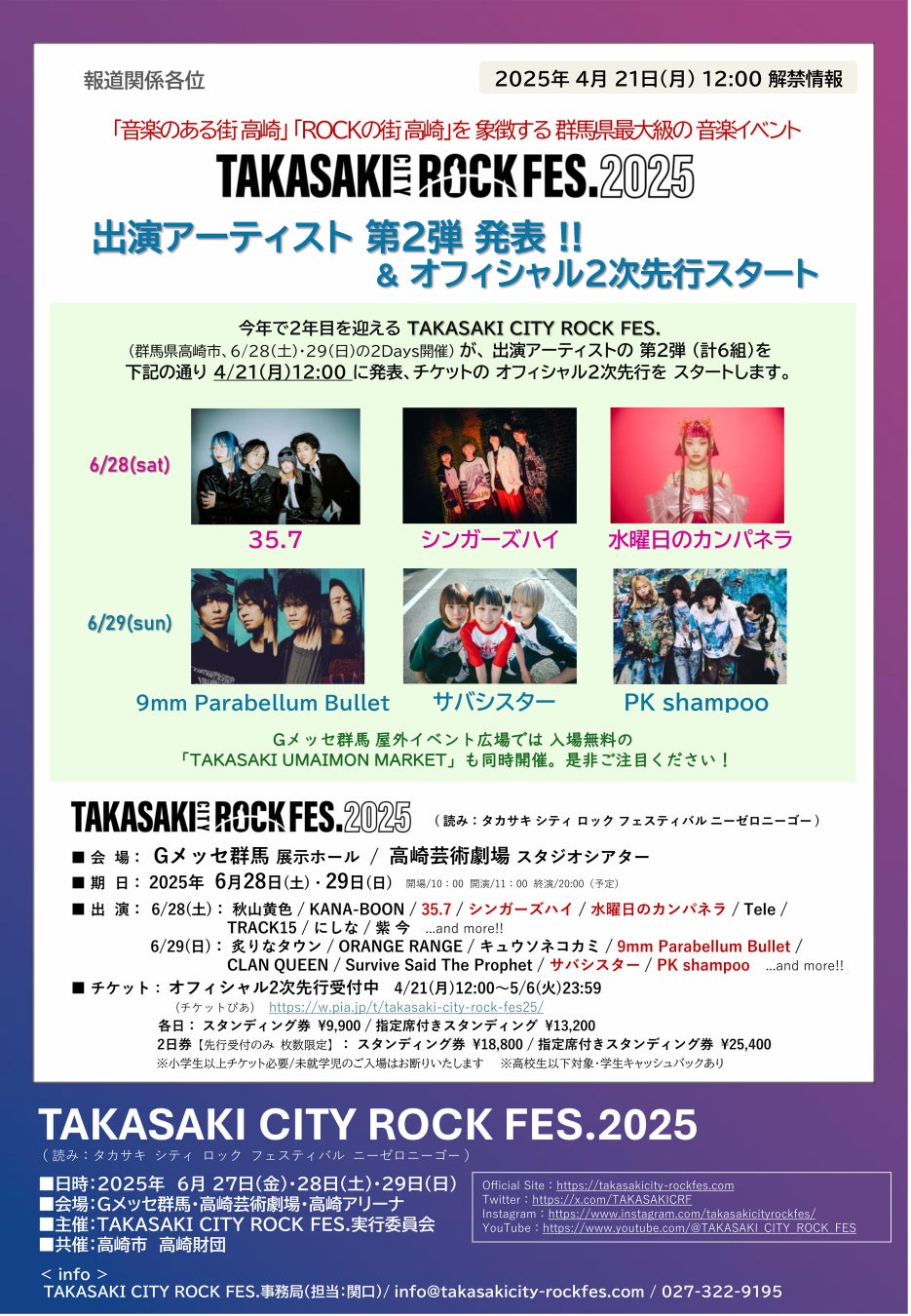 お待たせしました!『高崎シティロックフェス.2025』第2弾出演アーティスト、ついに発表!28日(土)は、35.7、シンガーズハイ、水曜日のカンパネラ、29日(日)は、9mm Parabellum Bullet、サバシスター、PK shampoo の計6組が新たに参戦決定!