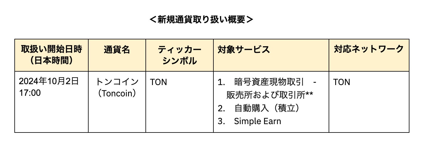 **なお、新規追加されるTONにおいて、日本円取引ペアには対応しておりません。対応している取引ペアはそれぞれ以下の通りです。