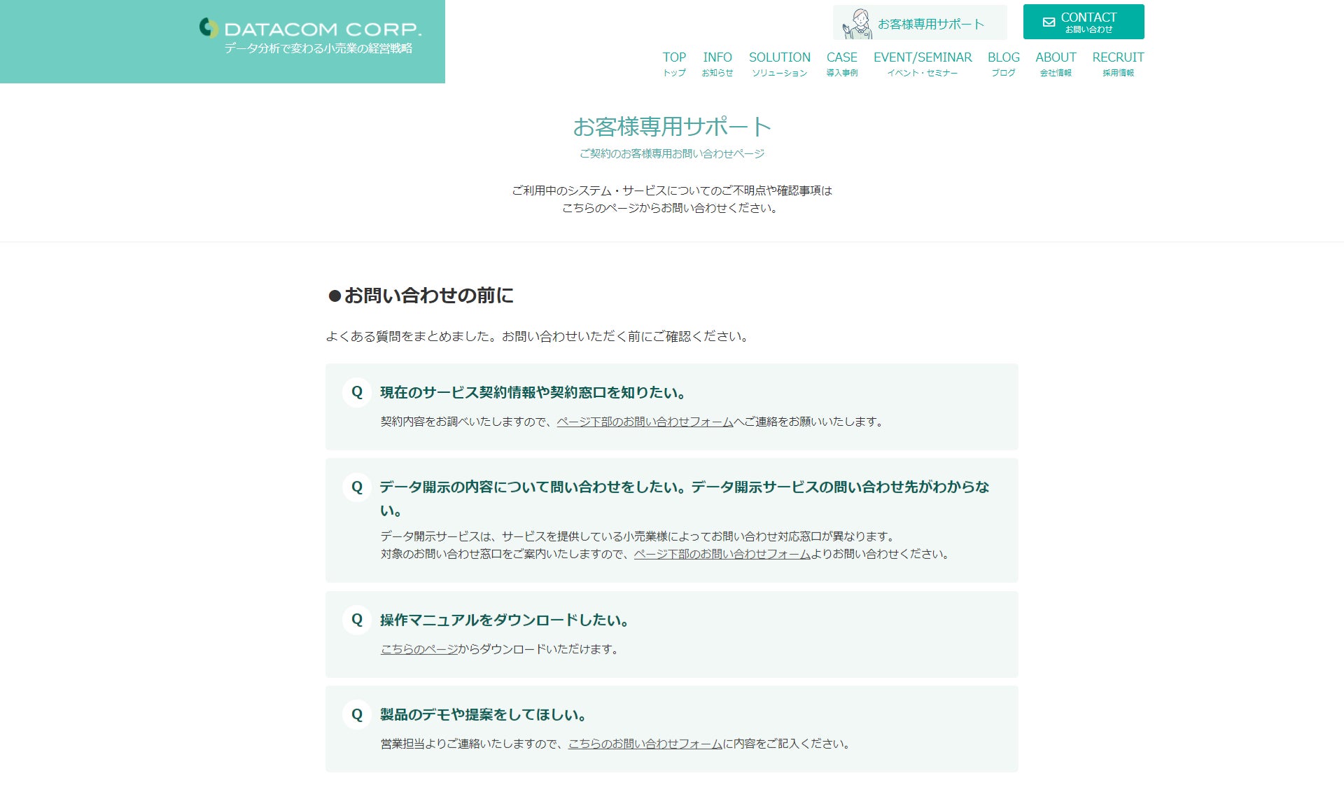 お客さまに当社サービスをより一層ご活用頂けるように、サポート体制を充実させました。お客さま専用のページを設置し、よくある質問やマニュアルなどのコンテンツを設置いたしました。また、簡単にお問い合わせ頂けるようにサポート担当者直通のフォームも新設しております。