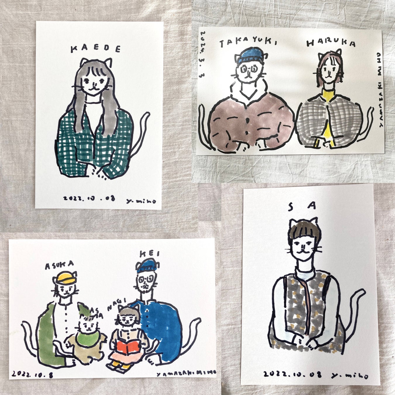 猫バージョンのあなたを描く「ねこにがおえ」。猫に見立てた似顔絵をその場でお描きします。