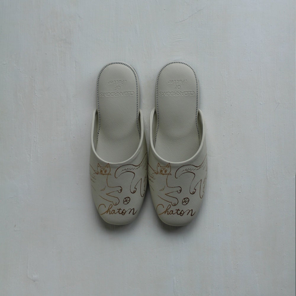 永く愛されていながらも、いつしか工場が姿を消し、現在は数えるほどになったビニールスリッパ。「CLOAKROOMS」は、フランス語でスリッパの意味を持つPANTOUFLE (パントゥフル)と呼ぶことで新たなスタイルとして継承し、長い歳月をかけ生まれた無駄のないフォルムと機能美を残しています。本イベントでは、仔猫柄をはじめ、さまざまなPANTOUFLEが並びます。