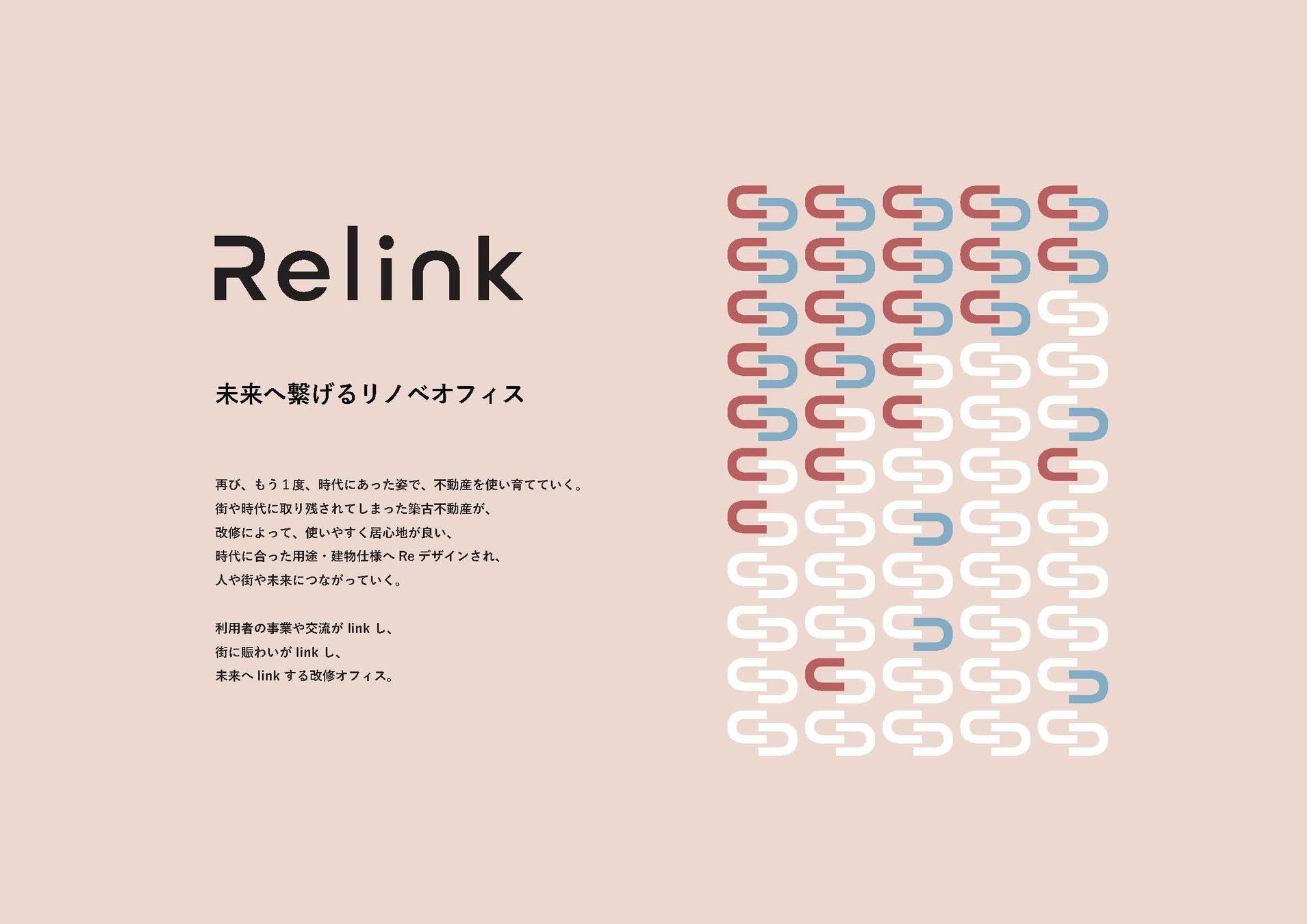 Relinkは、「未来へ繋げるリノベオフィス(※1)」をコンセプトとしています。利用者の事業や交流がlinkし、街に賑わいがlinkし、未来へlinkするリノベーションオフィスとして、築古不動産や街をバリューアップしていきます。