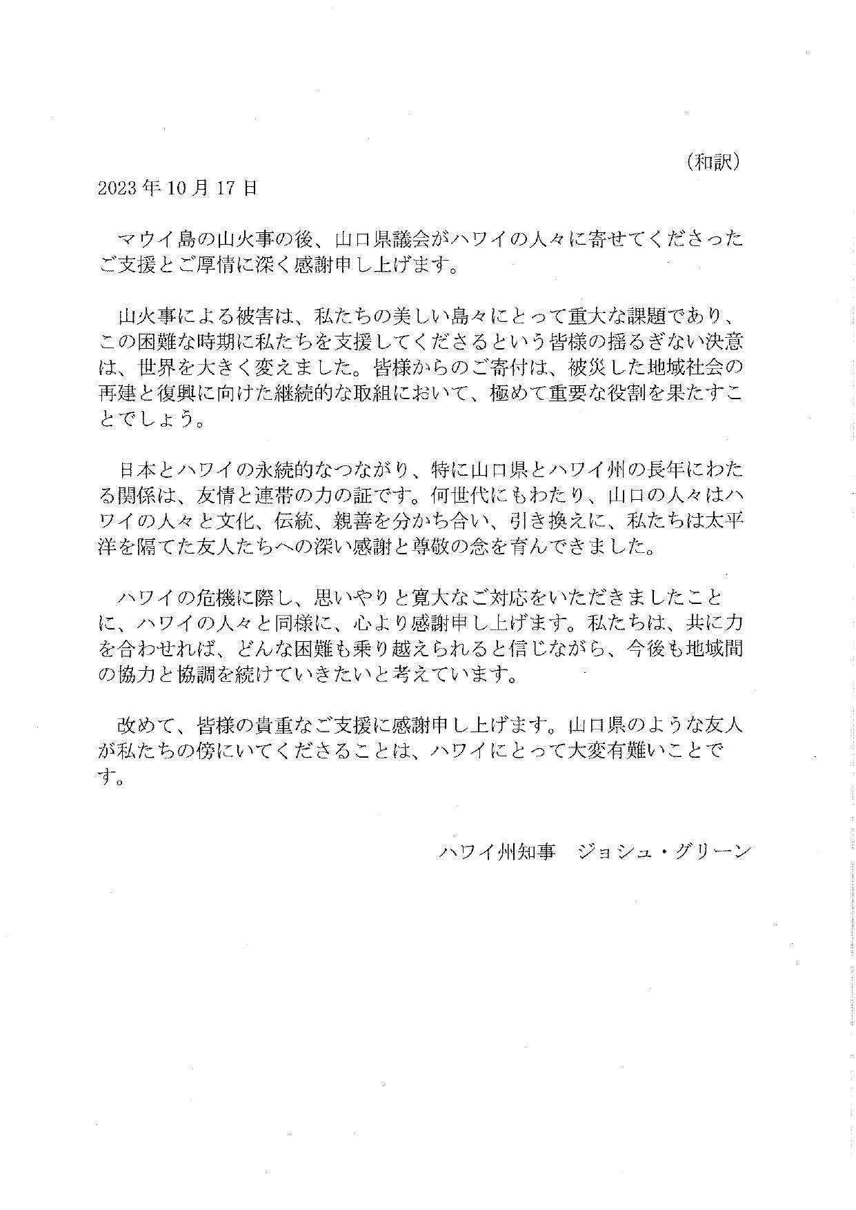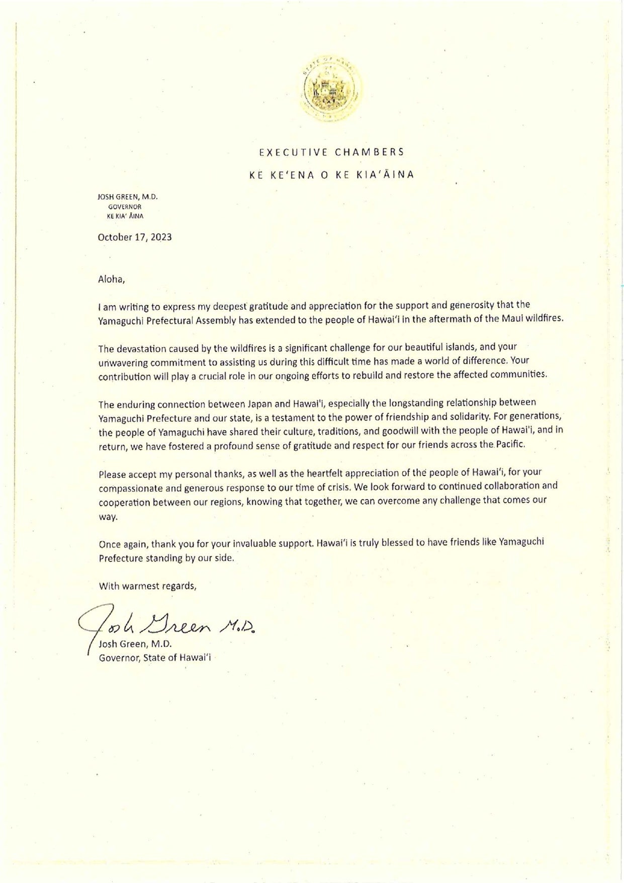 この度、山口県議会議長 柳居俊学様がハワイ州知事ジョシュ・グリーン様に救援金をお渡しになり、ハワイ州知事ジョシュ・グリーン様よりお礼状をいただきましたのでお知らせいたします。