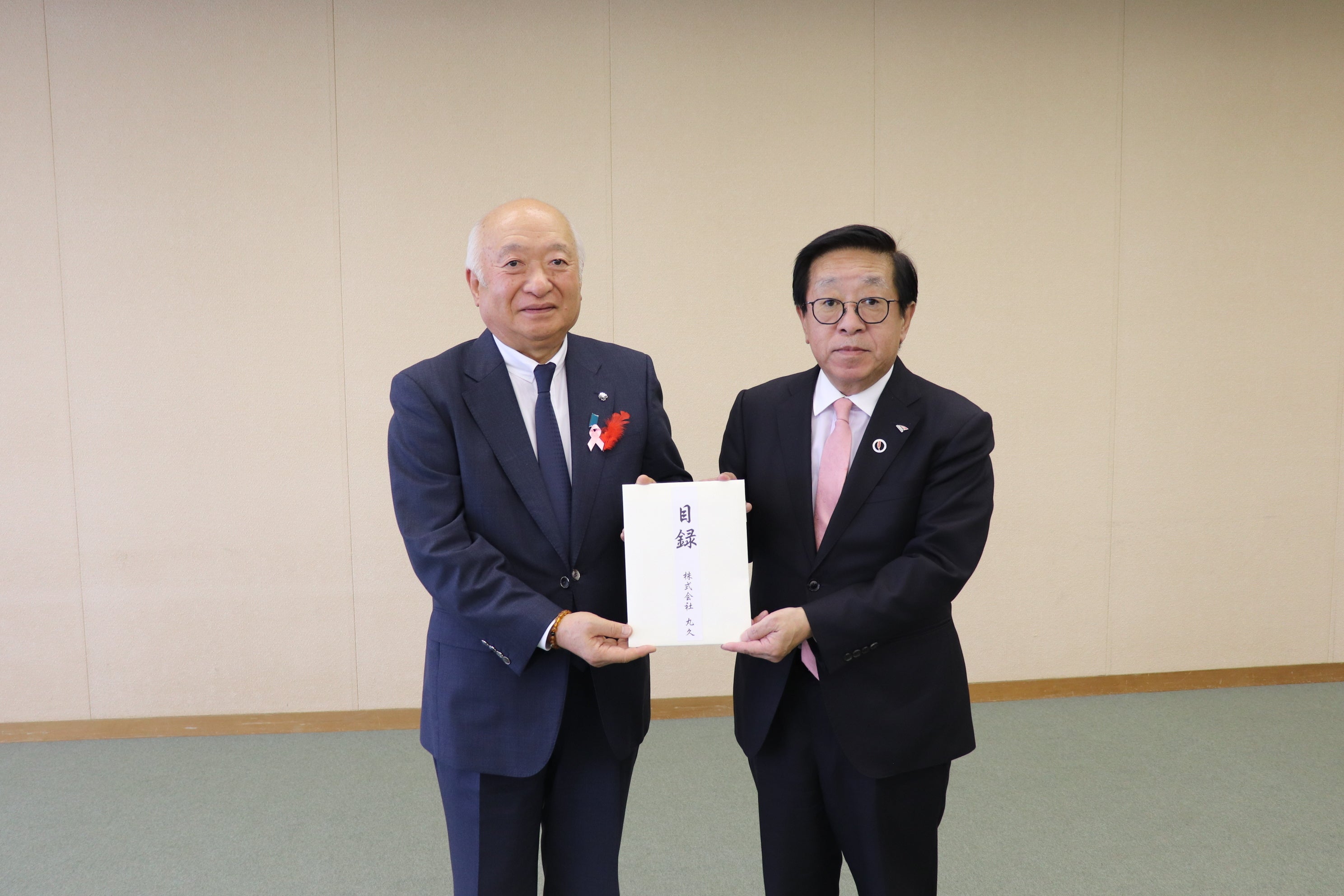 当社では山口県と姉妹連携先である米ハワイ州マウイ島山火事による被災を受けて2023年8月16日(水)から9月25日(月)までの期間に救援金の募金を丸久グループ各店舗と各事業所にて実施し、店頭の募金箱やイベントで募金いただいた救援金及び株式会社丸久からの災害見舞金を2023年10月6日に山口県議会議長 柳居俊学様に寄託いたしました。