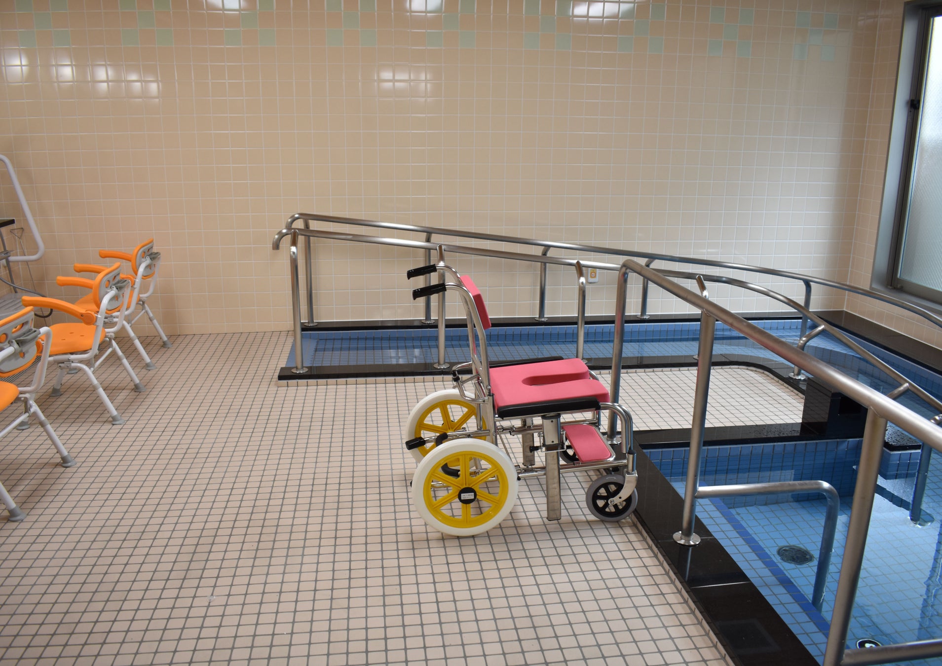 大浴場は浴室用車いすのまま浴槽に入れるようスロープを設置し、可能な限り大きなお風呂でゆったりと入浴していただけるよう工夫しています。もちろん、寝たきりの方など座位の保持が困難となられた方にも安心して入浴していただけるように機械浴槽もご用意しています。
