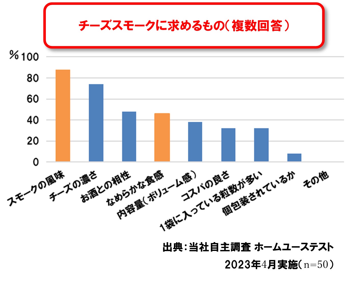 「チーズスモーク」は2023年より販売しておりましたが、この度「さらにやわらかくなめらかな食感」にリニューアルを行いました。お客様がスモークチーズに求めるものとして、スモーク風味の他、「なめらかさ」も重視点になっています。リニューアル品は、配合を見直すことで、さらに「やわらかくなめらかな食感」を実現しました。