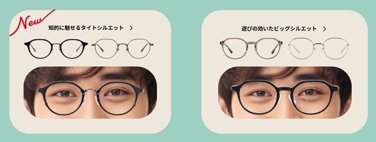 今回は人気の「ボストン型」に、小ぶりなサイズ感でタイトなシルエットに仕上げることによって、フォーマル感や大人っぽさが増し、丸メガネでありながら知的でクールな目元を演出する新モデル(タイトシルエット)を追加いたします。従来モデルでは敢えてオーバーサイズ気味に着用することによって、カジュアル感や丸メガネの持ち味である穏やかで親しみやすい雰囲気愉しんでいただくことを狙いとした設計をしており、ぜひ店頭にて、雰囲気の異なる2タイプのサイズ感をかけ比べてみてください。