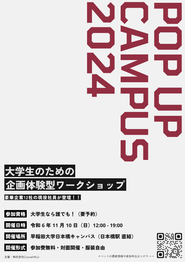 2024年11月10日(日)、企業と大学のコラボレーションから新たなイノベーションを目指す株式会社CourseVALU(本社所在地:東京都新宿区)は、大学生のための企画体験型ワークショップ「POP UP CAMPUS 2024」を開催いたします。
