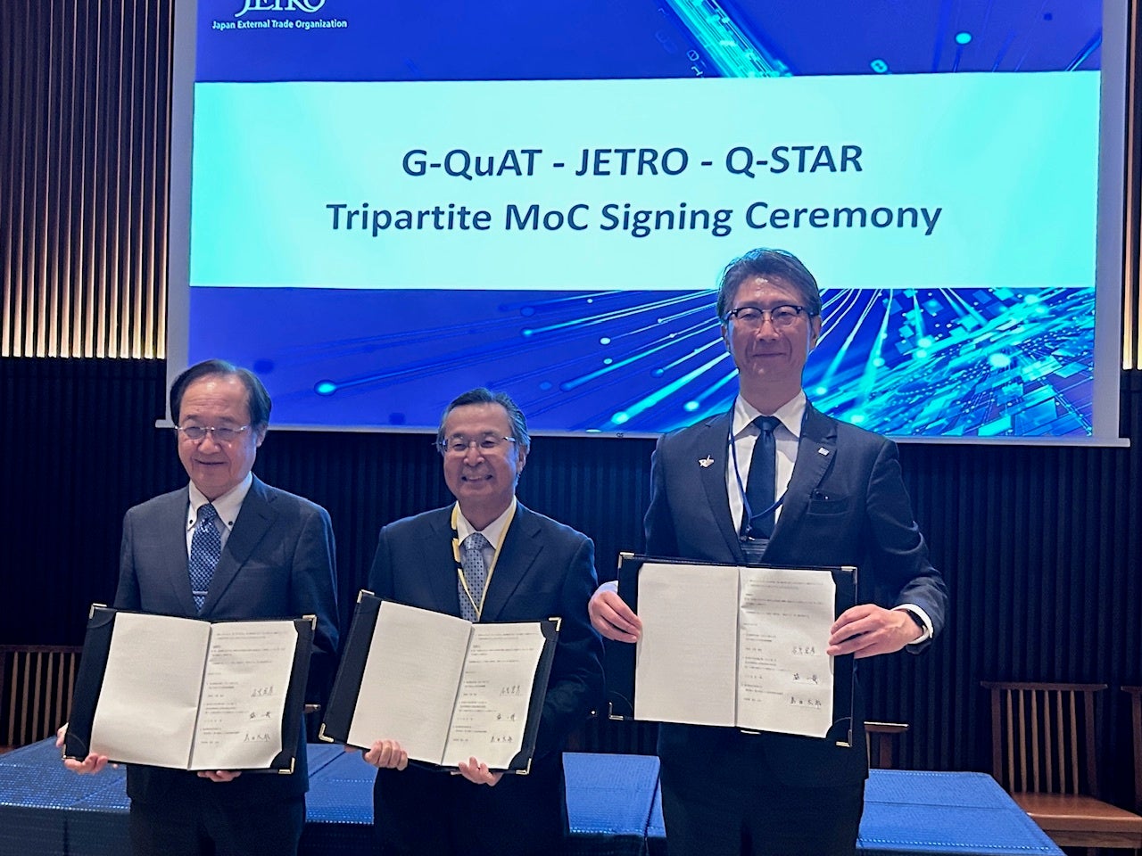 一般社団法人量子技術による新産業創出協議会(以下、Q-STAR)は、日本貿易振興機構(ジェトロ)、国立研究開発法人産業技術総合研究所 量子・AI融合技術ビジネス開発グローバル研究センター(以下、G-QuAT)と、3月5日、量子技術分野における国際連携促進に関する連携協力覚書を締結しました。