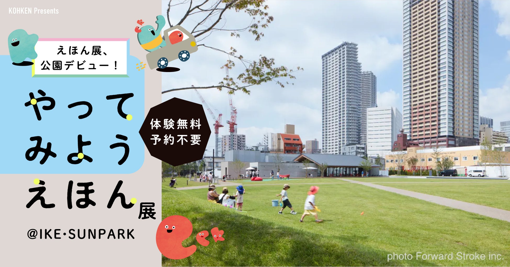 「ポンッパカーバ!」は、広報技術研究所と としまみどりの防災公園(IKE・SUNPARK)が共催する、「あそび」と「まなび」を融合したワークショップイベントです。初開催となる今回は、豊島区内最大級のオープンスペースを誇る東池袋の公園「IKE・SUNPARK」が舞台。「やってみようえほん展」に加えて、リメイク素材を使った「ラジコンカー」や「こいのぼり」づくりなど、「つくるたのしさ」や「モノやコトの仕組み」を体験できるコンテンツを楽しめます。
