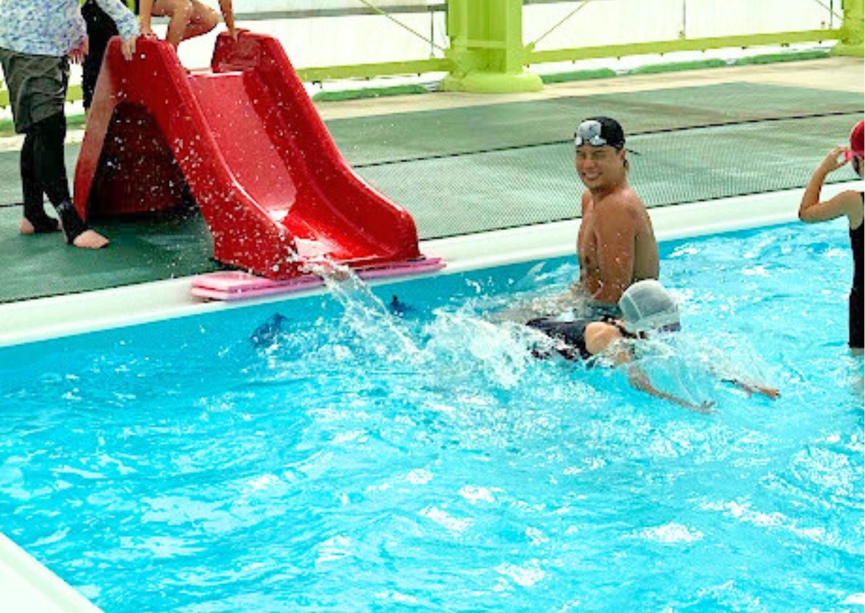 愛知県北設楽郡東栄町の東栄小学校において、岡崎竜城スイミングクラブ(以下、岡崎竜城SC)は、2024年7月3日から4日にかけて、全校生徒91名に向けた水泳指導を行いました。岡崎竜城SCによる東栄町での水泳指導は平成6年(1994年)に始まり、今年でちょうど30年目を迎えます。指導は東栄町B&G海洋センタープールで行われました。今年度の指導は江戸勇馬選手、今城拓海選手、イサ・アルアダウィ選手の3名の現役トップスイマーが指導にあたり、子どもたちと交流しました。