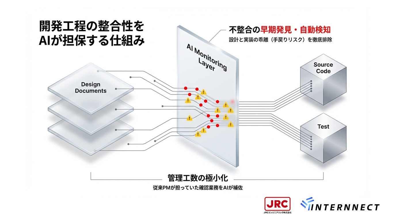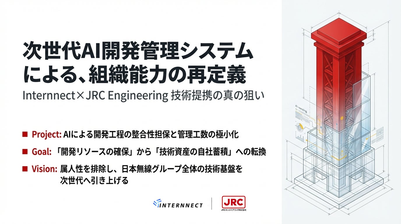 JRCエンジニアリング株式会社(本社:東京都三鷹市、代表取締役社長:岡村 俊幸、以下「JRCE」)と、株式会社Internnect(本社:千葉県市原市、代表取締役:岡本 龍一、以下「Internnect」)は、AIを活用した開発管理基盤の共同構築に向けた技術提携を開始したことをお知らせいたします。